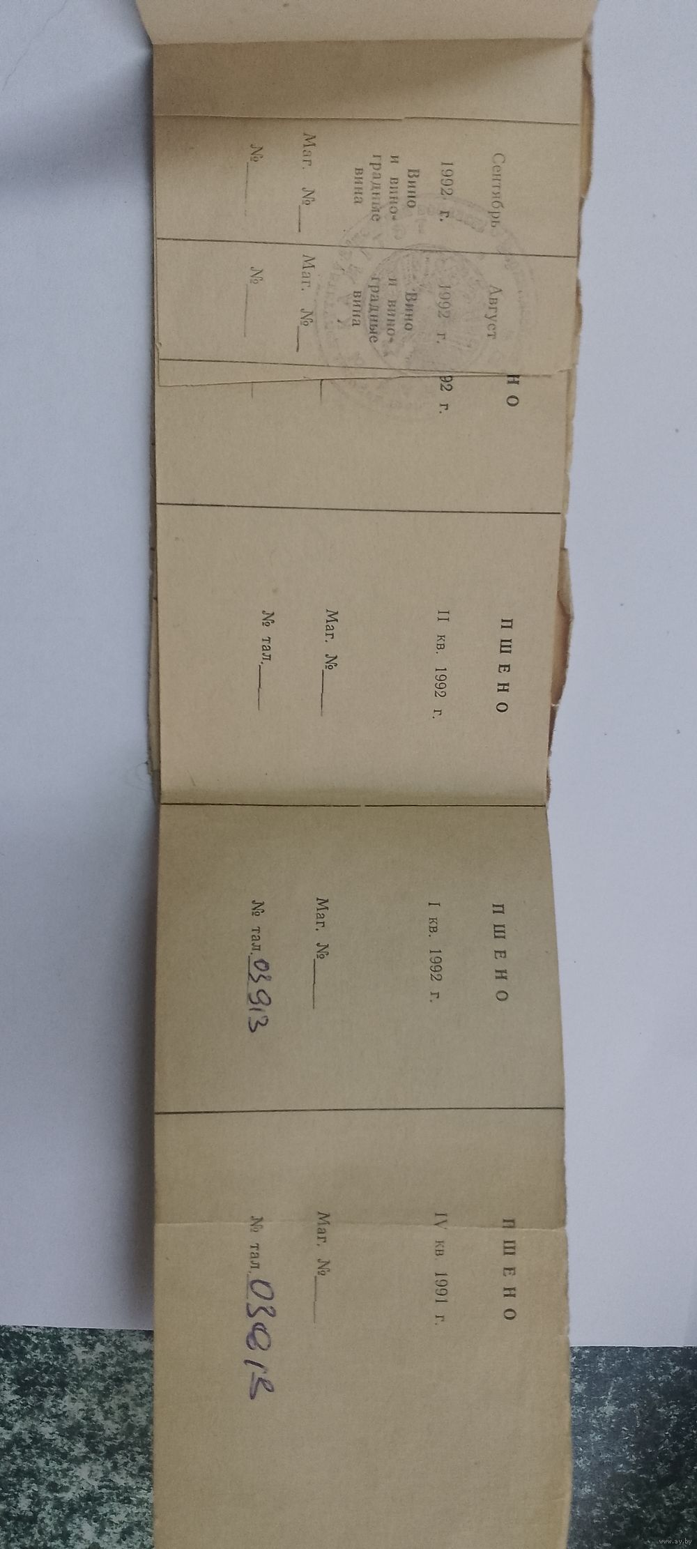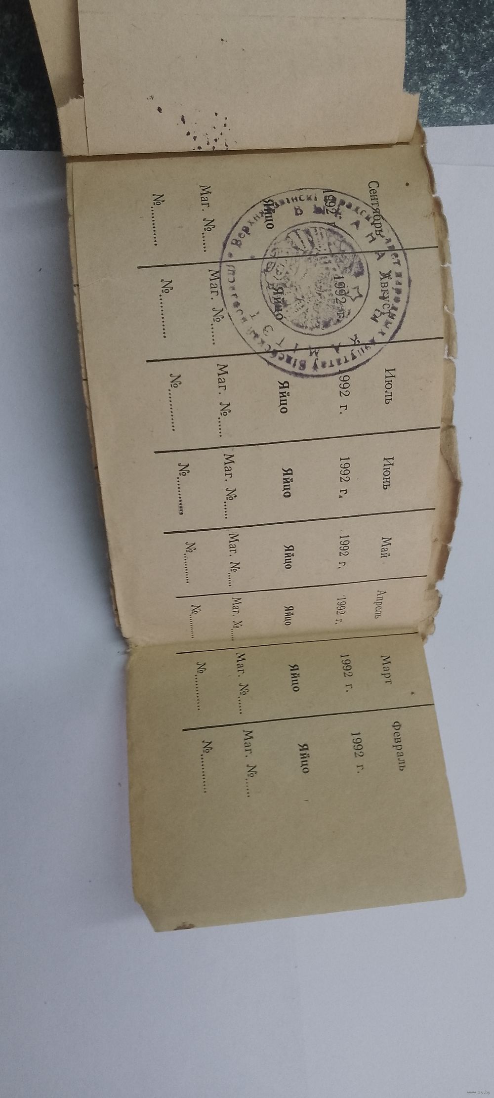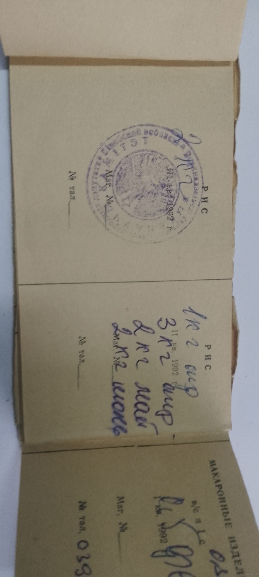 Талоны на мыло туалетное-9шт, мыло хозяйственное- 3шт, стиральный порошок-6шт, вино- 2 шт, пшено-4шт, мука- 2 шт, макаронные изделия- 3 шт, манная крупа-3шт, прочая крупа- 3шт, масло растительное- 6 шт, соль- 12-шт, спички-12шт, табачные изделия-1шт, масло сливочное-8шт, яйцо-8шт, колбасные изделия- 8шт, мясо-8шт