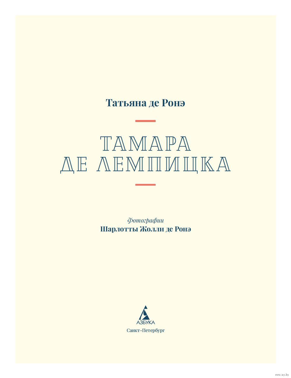 Татьяна де Ронэ – англо-французская писательница, сценарист, журналист и литературный критик, произведения которой переведены на многие языки мира и изданы миллионными тиражами. Книга о знаменитой художнице польского происхождения и иконе стиля ар-деко Тамаре де Лемпицка – личный взгляд писательницы, которую роднит с ее героиней уникальный взгляд на мир человека, принадлежащего нескольким культурам и не понаслышке знакомого с артистической средой: "Искусство Тамары де Лемпицка привлекало меня с юности. Тогда я понятия не имела о ее бурной биографии и масштабе творческих амбиций. Каким она была человеком? Где жила? Как стала выдающейся художницей? Эта книга – мое путешествие в приватный мир Тамары, попытка проникнуть в ее секреты и творческие замыслы, уловить пульсирующий ритм Парижа двадцатых годов. Я рассказываю ее историю, а моя дочь Шарлотта в своих фотографиях воскрешает интригующую нас и по сей день легенду о блестящей королеве ар-деко".