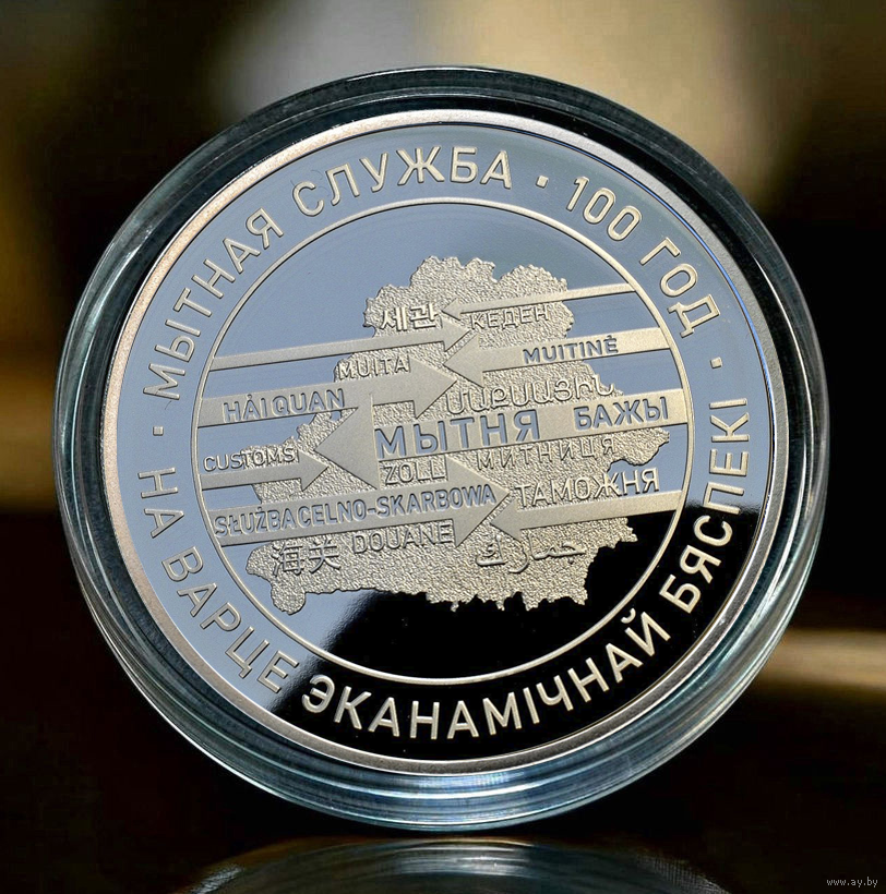 вверху – рельефное изображение Государственного герба Республики Беларусь; в центре – изображение геральдического знака – эмблемы Государственного таможенного комитета. Вокруг надписи: РЭСПУБЛІКА БЕЛАРУСЬ; внизу – номинал: 20 РУБЛЁЎ (на серебряной) и 1 РУБЕЛЬ (на медно-никелевой), год чеканки (на серебряной справа – проба сплава).