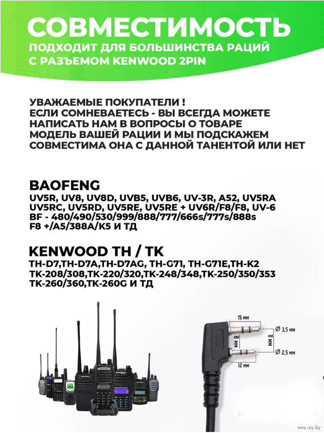 Разъем тангенты Baofeng стандартный типа Кенвуд и подходит не только к большинству радиостанций Baofeng (UV-5R (все модификации), BF-888S, BF-M4, BF-R5, BF-88E, BF-H7, DM-5R, DM-1701, DM-1801, DM-1702 и.т.д), но и ко многим рациям других производителей: Kenwood, Comrade R3, Ajetrays, Roger, Midland G10, Midland G14, Vector 44 Turbo, Vector 44 Master, Vector 44H, Аргут, WLN и.т.д.