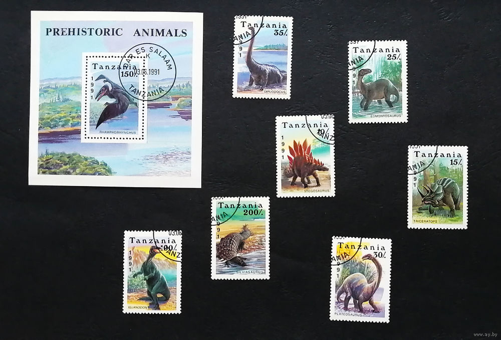 Танзания 1991 г. Динозавры. Доисторические животные. Фауна, полная серия из 7 марок + Блок #0219-Ф1P42