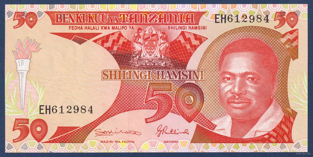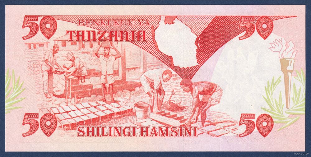 Танзания, 50 шиллингов 1992 г., P-19 (EH, президент Али Хасан Мвиньи, строительство дома), UNC