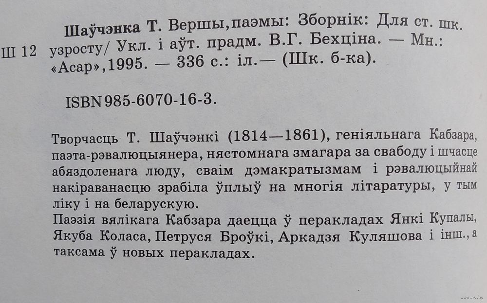 Тарас Шаўчэнка. Вершы. Паэмы. (Школьная бібліятэка). Мн.: Вытвор.-камерц. інавац. прадпрыемства "Асар", 1995 г. 335 с. Цверды пераплет.