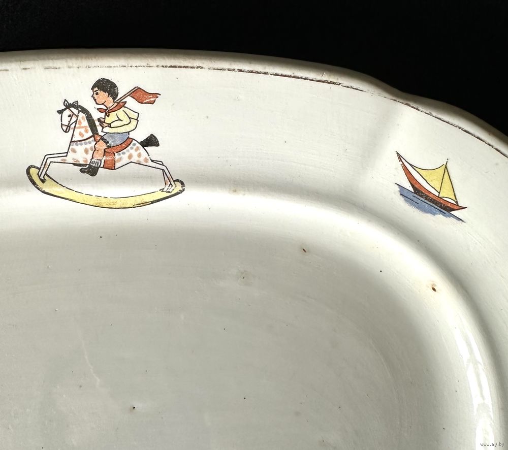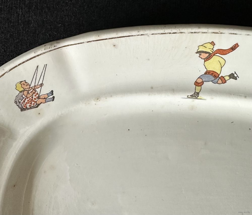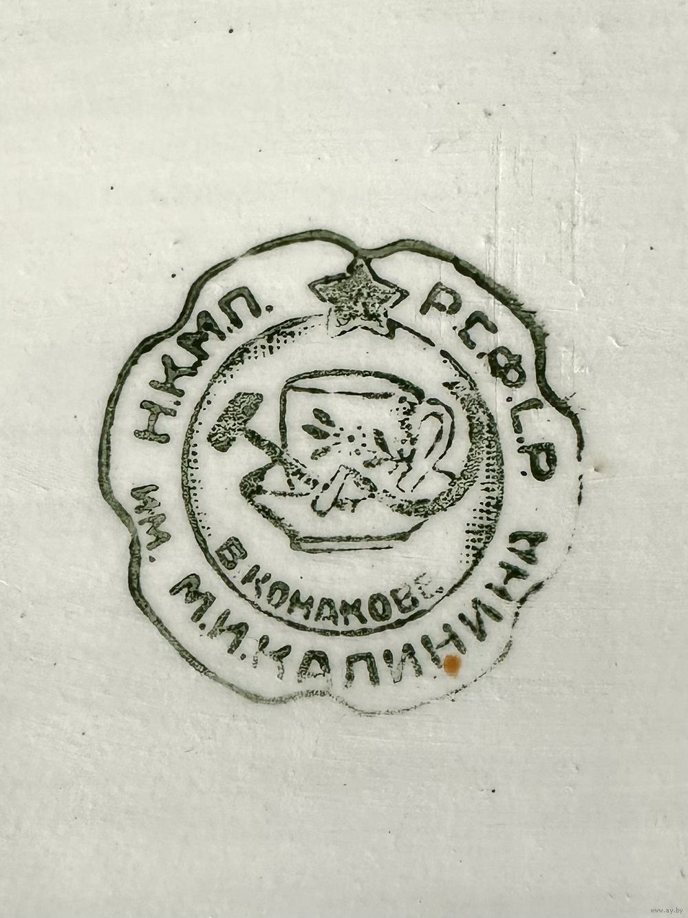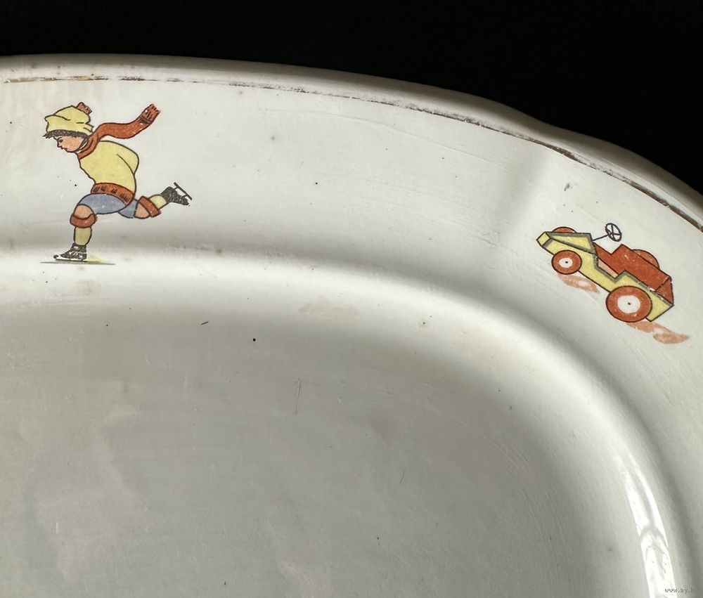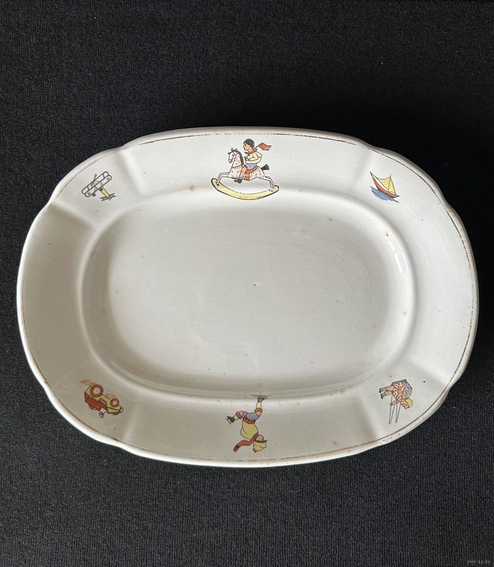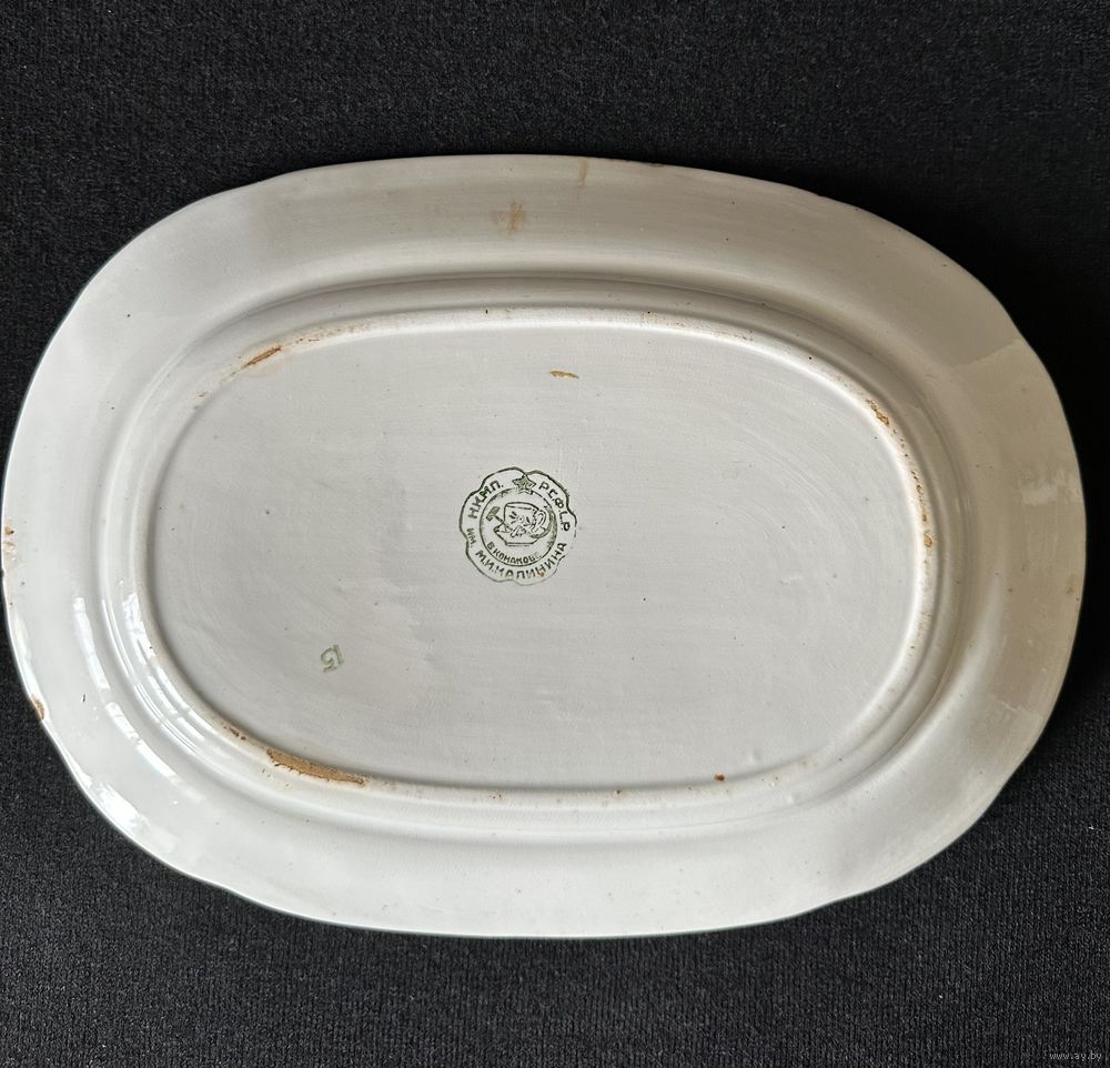 Довоенная тарелка Конаково, фабрика им. М.И. Калинина, 1929-1940 гг. Фаянс, золочение, потёртости. Размер 21,5 х 30 см.