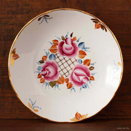 Сухарница диаметром 27 см, рисунок «Розы в бутонах», мазковая живопись, ручная роспись, один пурпур, отделка золотом. Автор рисунка – возможно Гатальская Людмила Николаевна: а) сухарница б) клеймо с обозначением группы разделки «В/г», цена не указана