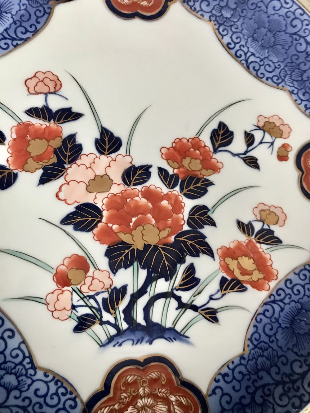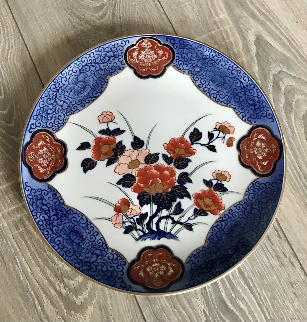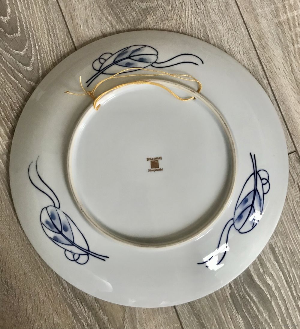 Декоративная фарфоровая тарелка Gold Imari,изготовлена японскими мастерами в ХХ веке, ручная роспись,маркировка,клеймо.Наличие в маркировке слова Gold свидетельствует о ценности и значимости изделия,тарелка находится в отличном состоянии,с обратной стороны имеются отверстия для подвеса,диаметр 30,5 см.