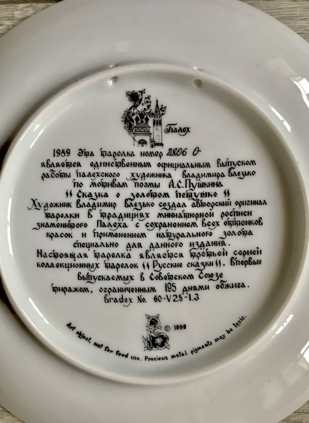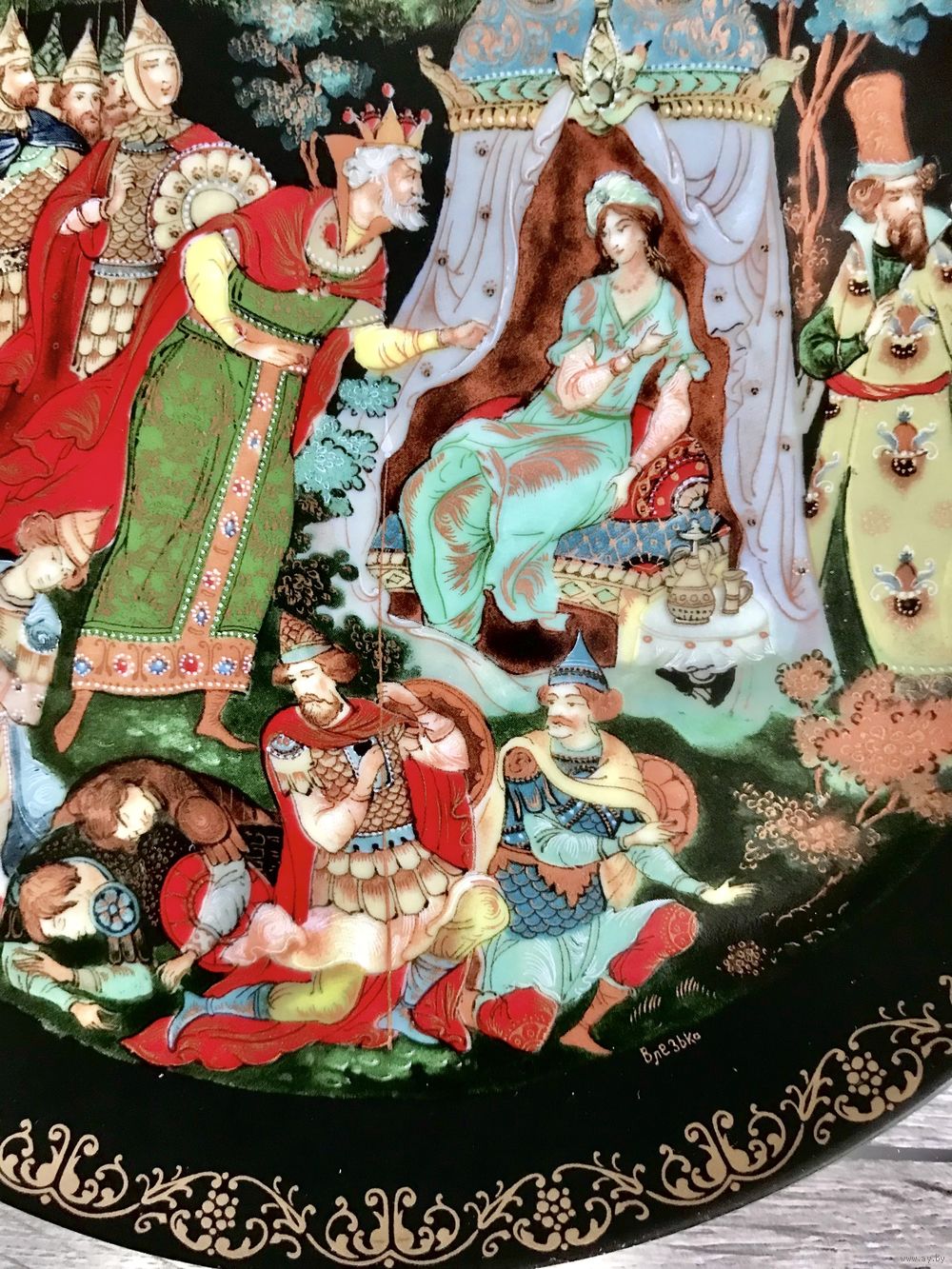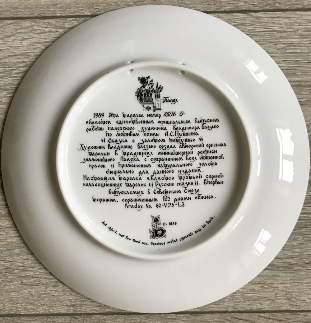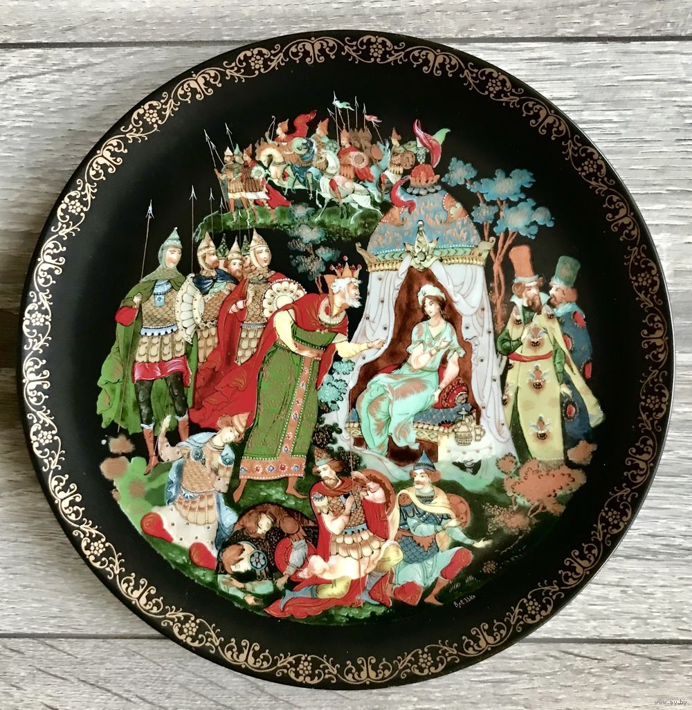 Винтажная фарфоровая декоративная тарелка. Палех. Роспись по мотивам произведения А.С.Пушкина «Сказка о золотом петушке». Диаметр 19,5см. С обратной стороны имеются отверстия для подвеса. Состояние хорошее.