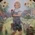 Рисунок девочка или мальчик, цветы: герань, люпины, подсолнухи, тюльпаны, птичка, лейка.