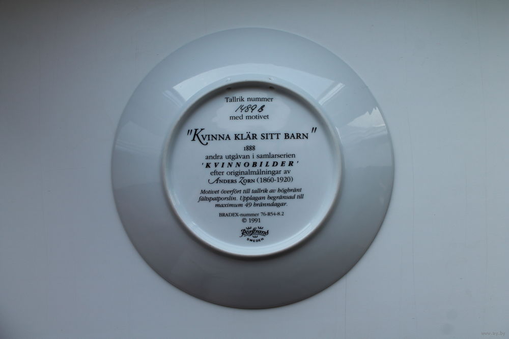 Тарелка коллекционная [1991г., Швеция, Rorstrand, Женщина одевает ребенка, Bradex #76-R54-8.2] D=21см.