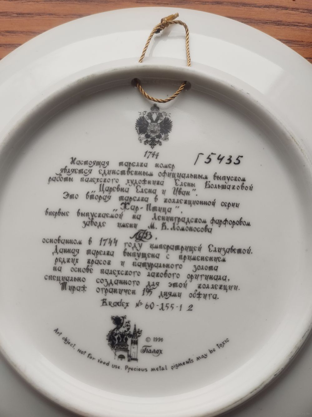 На обратной стороне тарелки официальная информация о серии/тираже Bradex № 60-Л55-1.2, клейма ЛФЗ и Палеха