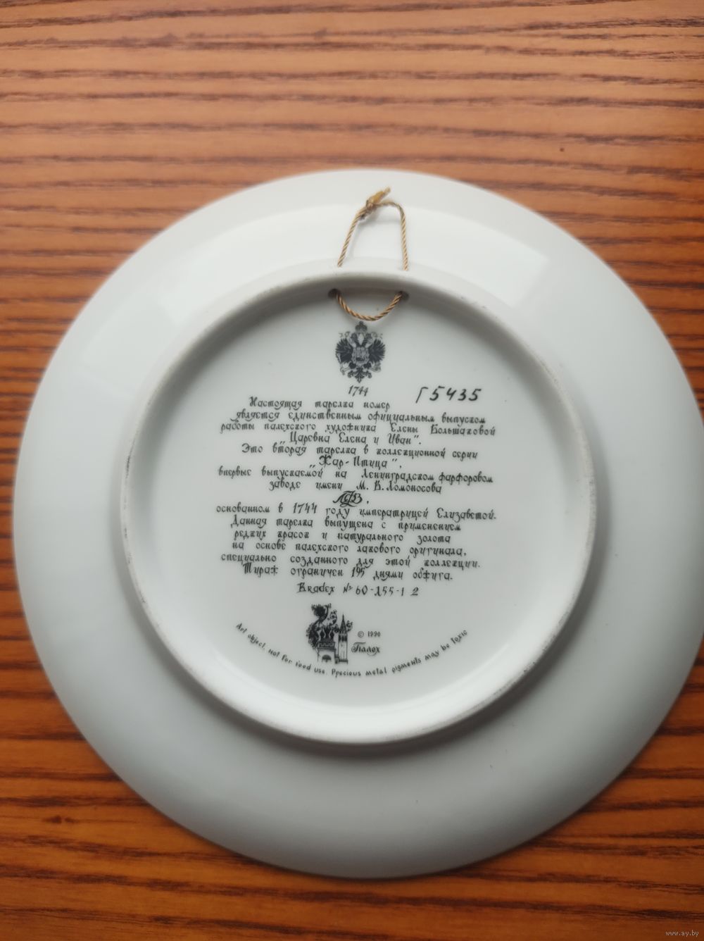 Вторая тарелка в коллекционной серии "Жар-птица", выпущенной на Ломоносовском фарфоровом заводе (ЛФЗ) в 1990 г. Тарелки серии выпускались по эскизам русских мастеров по заказу американской фирмы Bradex и экспортировались в США. В России официально не продавались.