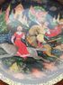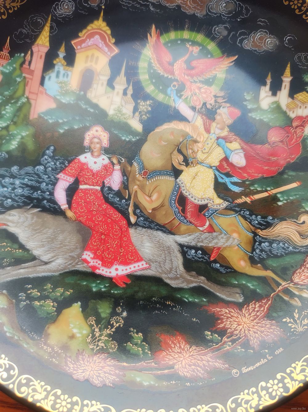 Для данной тарелки в 1989 году специально создан палехский лаковый оригинал работы палехской художницы Елены Большаковой.