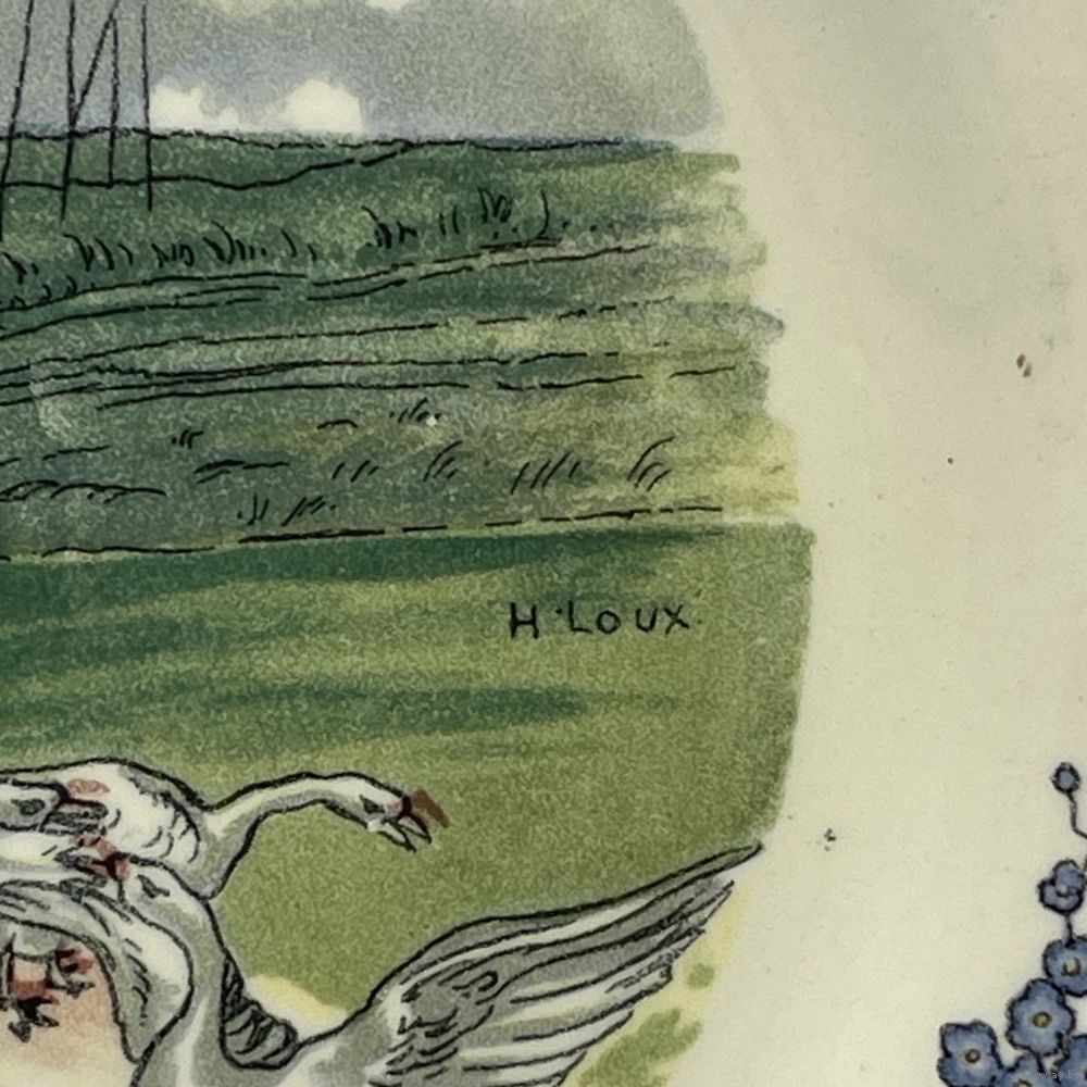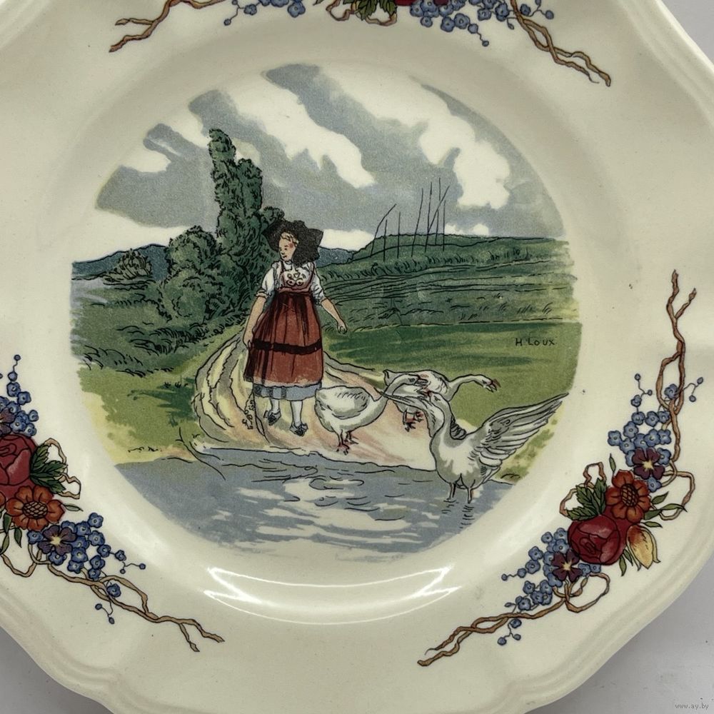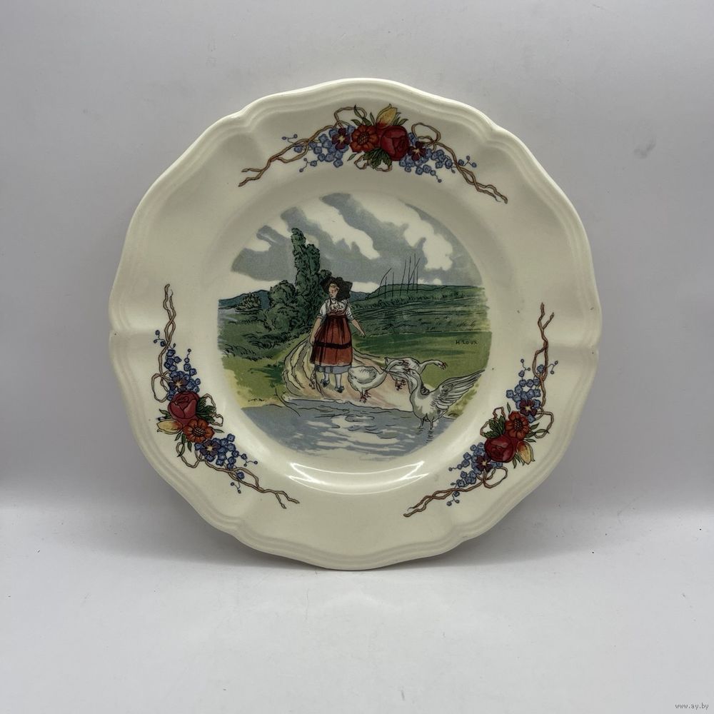 Антикварная фаянсовая тарелка ручной работы от мануфактуры Sarreguemines. Подглазурный ручной декор Obernai (Обернэ) с традиционными провинциальными сценами французского Эльзаса работы художника Анри Лу (Henri Loux). Франция. 1970-е г.г. Подглазурное клеймо. Диаметр 20 см. На обратной стороне несовершенства на глазури и следы от щипцов для обжига, как следствие ручной работы, не является дефектом. Можно мыть в посудомоечной машине.