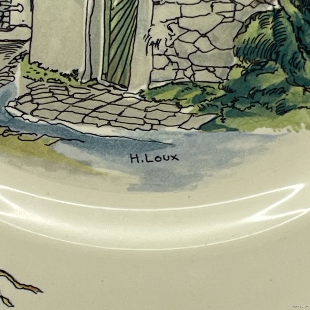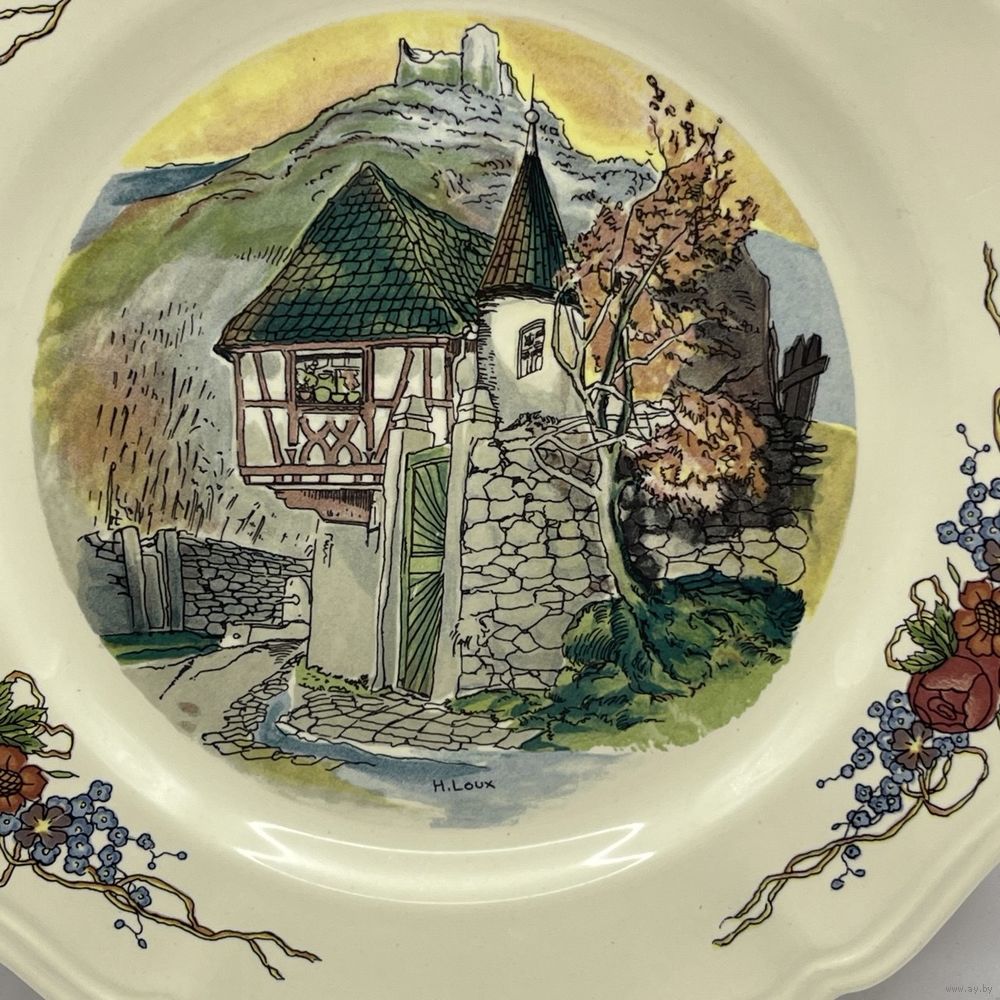 Антикварная фаянсовая тарелка ручной работы от мануфактуры Sarreguemines. Подглазурный ручной декор Obernai (Обернэ) с традиционными провинциальными сценами французского Эльзаса работы художника Анри Лу (Henri Loux). Франция. 1960-е г.г. Подглазурное клеймо. Диаметр 20 см. На обратной стороне несовершенства на глазури и следы от щипцов для обжига, как следствие ручной работы, не является дефектом. Можно мыть в посудомоечной машине.