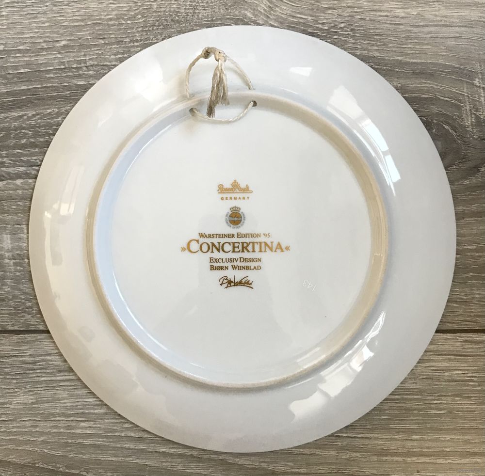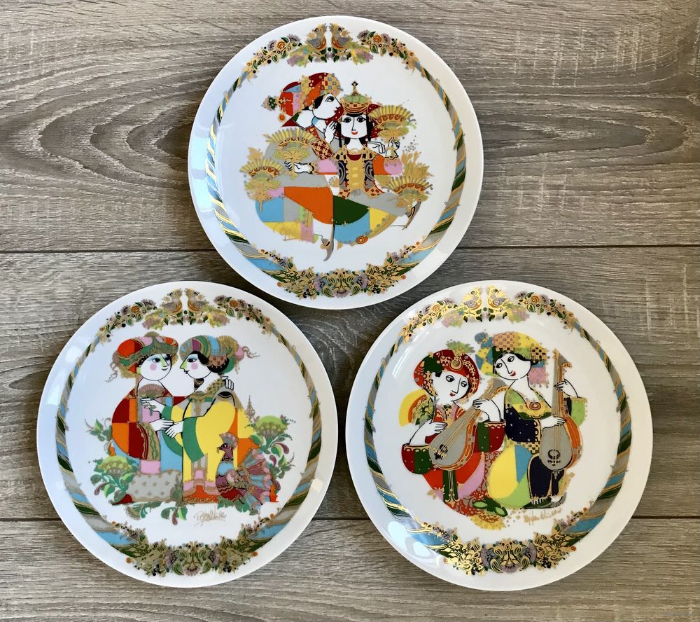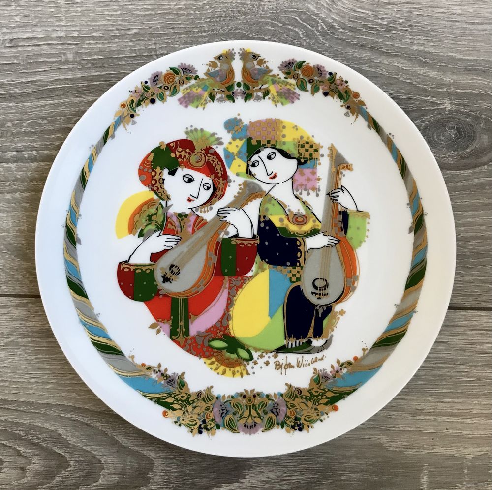 Фарфоровые декоративные тарелки известной немецкой мануфактуры Rosenthal из лимитированной серии «Музыканты», автор рисунков известный датский художник Bjorn Winblad. В наличии тарелки, выпущенные в 1994, 1995 и 1996гг. Диаметр 21см., с обратной стороны имеются отверстия для подвеса. Состояние хорошее.