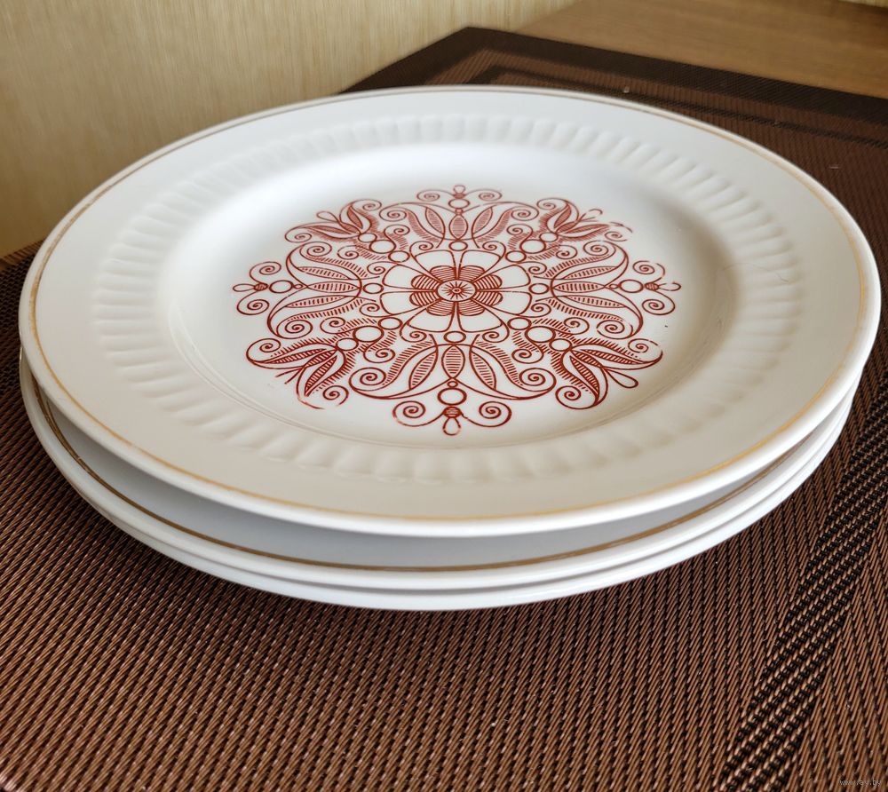 Тарелки 20 см, фарфор, деколь, отводка золотом, рельеф, синее клеймо 1968-83 гг. Минский фарфоро-фаянсовый завод. В наличии 3 шт.