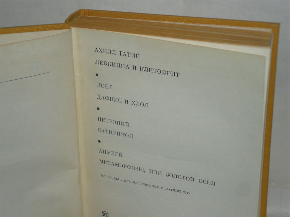 В том входят признанные образцы античного романа: «Левкиппа и Клитофонт» Ахилла Татия (перевод с древнегреческого В. Чемберджи), «Дафнис и Хлоя» Лонга (перевод с древнегреческого С. Кондратьева), «Сатирикон» Петрония (перевод с латинского Б. Ярхо), и «Метаморфозы» Апулея (перевод с латинского М. Кузмина).