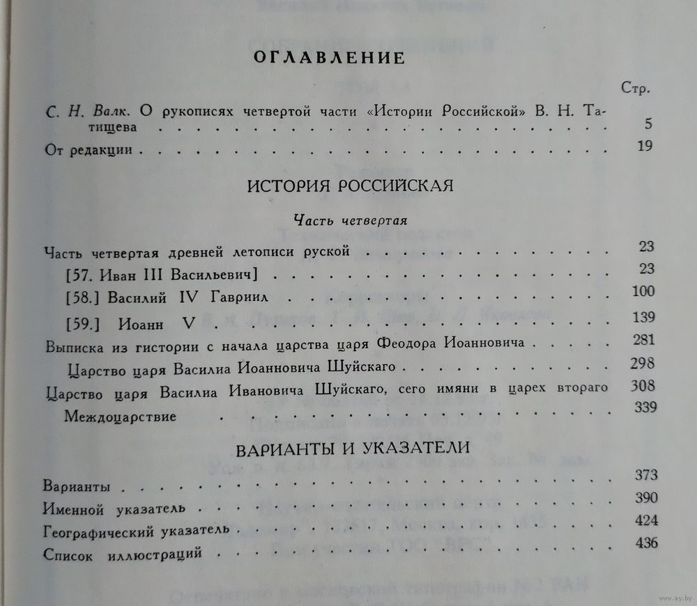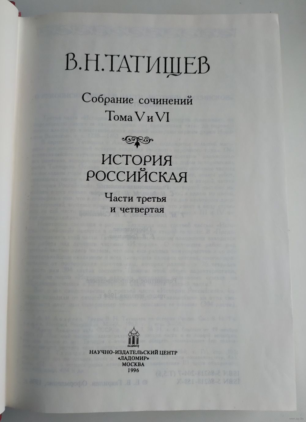 Татищев В.Н. Собрание сочинений . История российская в восьми томах (в пяти книгах) . Репринтное воспроизведение текста издания 1962-1968 гг. Редакторы А. И. Андреев, С.Н. Балк, М.Н. Тихомиров. Москва: Ладомир, 1994-1996г. 3480с., ил. Твёрдый переплёт, увеличенный формат.