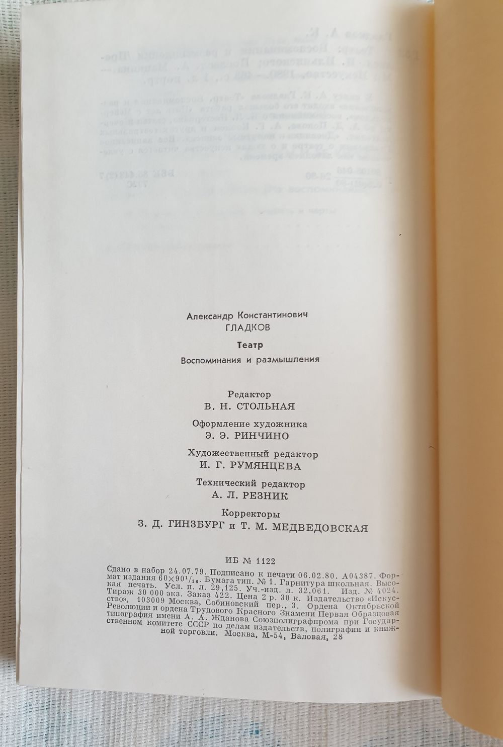 В книгу А. К. Гладкова "Театр. Воспоминания и размышления" входят его большая работа "Пять лет с Мейерхольдом", воспоминания о Б. Л. Пастернаке, статьи и очерки об А. Д. Попове, А. Г. Коонен и других театральных деятелях, "Дневники и попутные записи". Все написанное Гладковым о театре и о людях искусств читается с увлечением как летопись времени.
