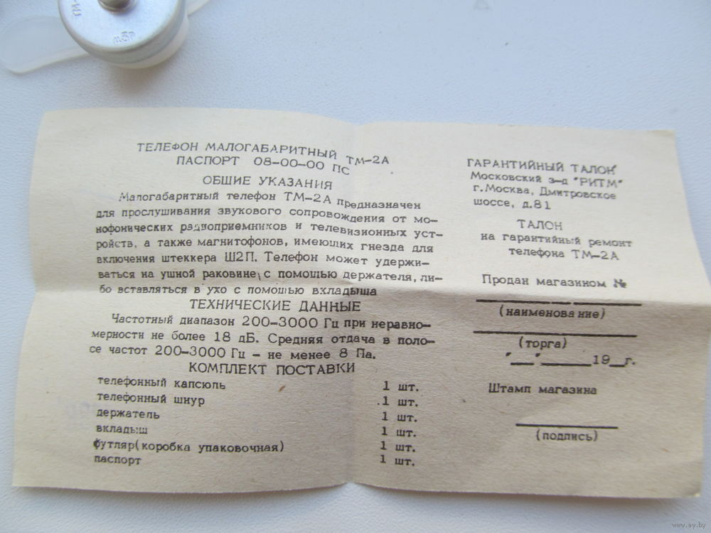 Телефон (наушник) малогабаритный ТМ-2А. Штеккер Ш2П под советскую радиоаппаратуру.