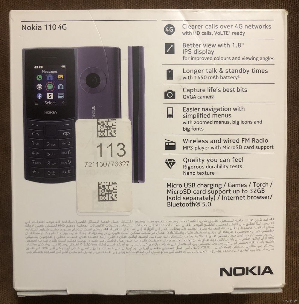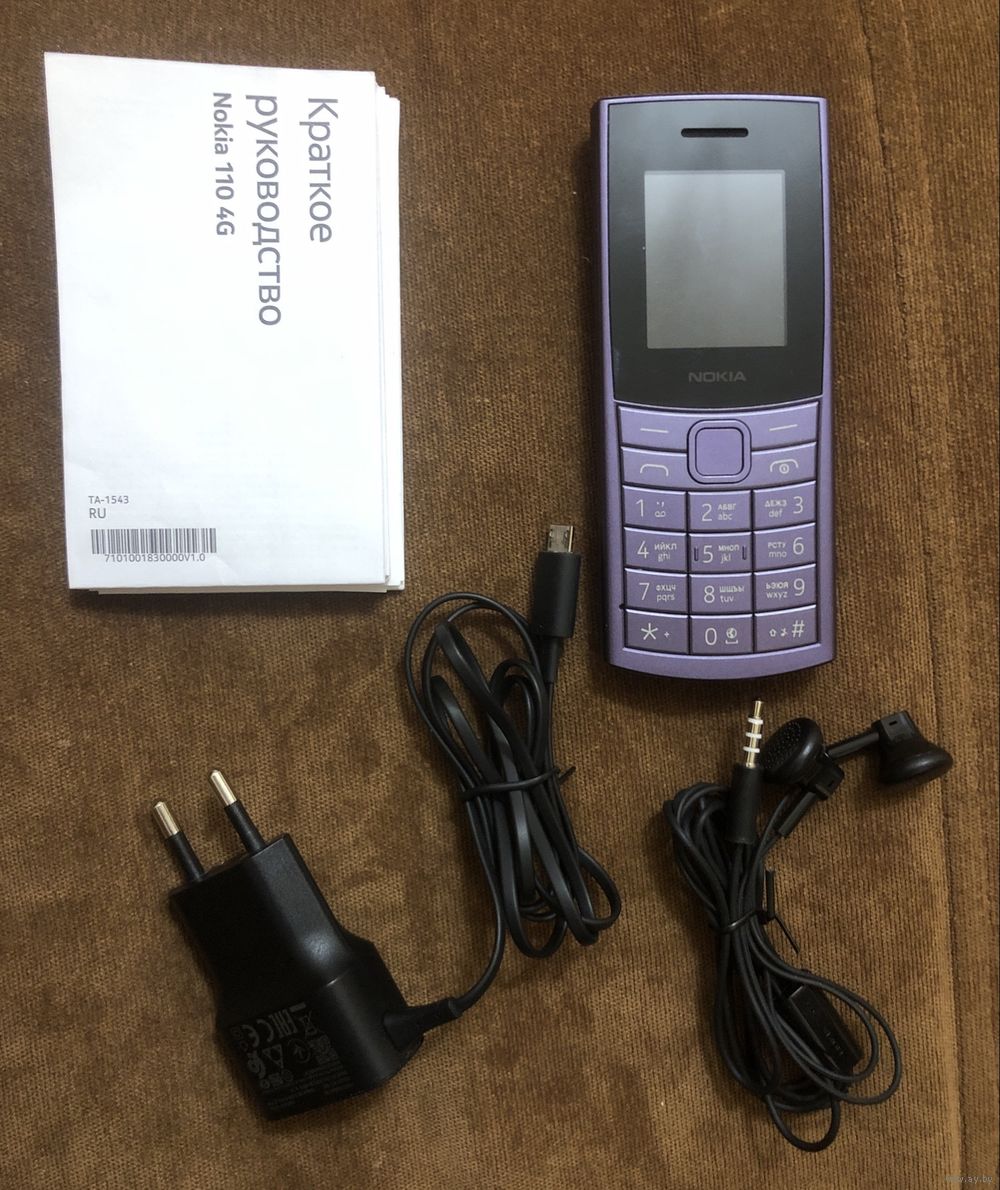 Телефон Nokia 110 4G Dual SIM (фиолетовый) кнопочный телефон, Nokia Series 30+, количество физических SIM-карт - 2, формат SIM-карты nano-SIM, поддержка 4G LTE, экран 1.8" TFT (128x160), UniSoC Tiger T117, ОЗУ 128 Мб, камера 0.08 Мп, память 48 Мб, поддержка карт памяти microSDHC, максимальная емкость карты памяти 32 ГБ, FM-приемник, передача данных EDGE, HSPA, HSPA+, LTE, bluetooth 5,0 аудиовыход 3.5 мм., влагозащита IP52, разъем подключения microUSB 2.0 тип аккумулятора Li-ion, емкость аккумулятора 1450 мА/ч, аккумулятор съемный, время разговора 8 часов, максимальное время ожидания 12 суток. В комплекте сетевой адаптер, наушники. В работе не был. Купили пожилому человеку, но не понадобился…