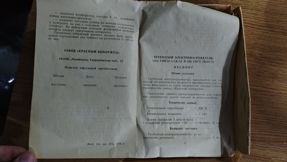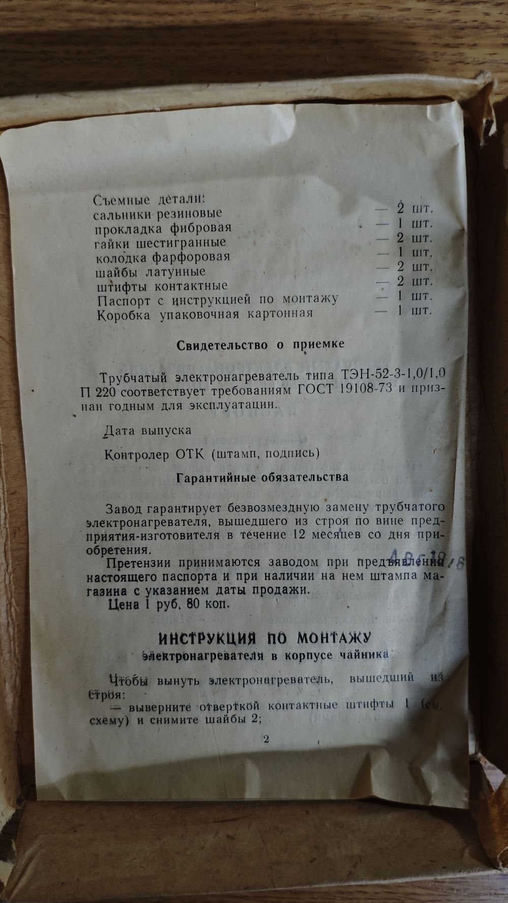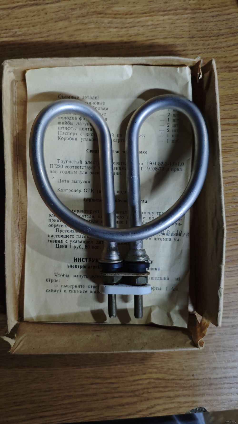 Продается совершенно новый, с хранения, трубчатый электронагреватель (ТЭН) в комплекте с паспортом и монтажными деталями. Идеально подходит для ремонта и реставрации советских электрочайников.