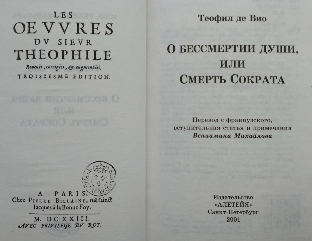 Тираж 1200 экз. 224 стр. Публикуемый впервые на русском языке парафразтрактат «О бессмертии души, или Смерть Сократа» французского философа, поэта, драматурга, автора прозаических сочинений Теофила де Вио (1590-1626), содержит кроме «сократического диалога» Платона «Федон» 1828 стихов, в которых представлена жизнь души и плоти, разума и страстей человека в земных пределах. В этом масштабном произведении определилась теофиловская концепция бонэспритизма, воспринятая Корнелем, Декартом, Паскалем, Расином... Для ссыльного поэта-философа парафраз-трактат, прочитанный при дворе Людовика XIII, был философской декларацией и средством защиты от преследований. Для современников же парафраз-трактат «О бессмертии души, или Смерть Сократа» оказался опорным на многие десятилетия духовной жизни произведением именно благодаря универсальности содержания, достигнутой соединением возможностей философии и поэзии. Книга адресована как специалистам, так и самому широкому кругу читателей, не сторонних духовному содержанию культуры XVII века.