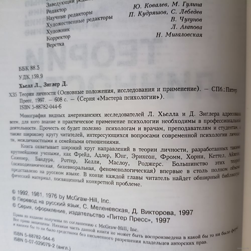 Монография видных американских исследователей Л.Хьелла и Д.Зиглера адресована всем, для кого знание и практическое применение психологии необходимы в профессиональной деятельности. Книга охватывает широкий круг направлений в теории личности, разработанных такими крупнейшими учеными, как Фрейд, Роттер, Келли, Маслоу, Фромм, Юнг, Адлер, Хорни, Роджерс. Большинство этих теорий (психодинамическая, бихевиоральная, феноменологическая) впервые в столь полном объеме представлено на русском языке. В конце каждой главы читатель найдет обширный библиографический материал, посвященный конкретной проблеме.
