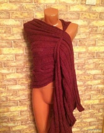Теплый и красивый вязанный палантин очень интересной модели. Палантин продевается на руку через отверстие, а с другой стороны оборачивает плечики. размер 2 м на 80 см. Цвет бордо. Очень теплый.