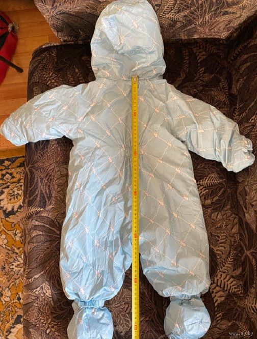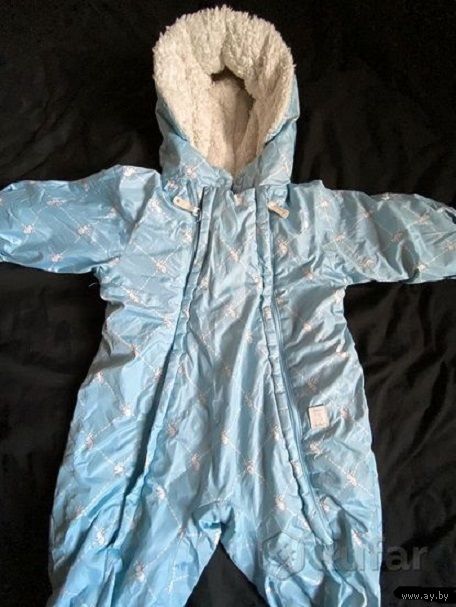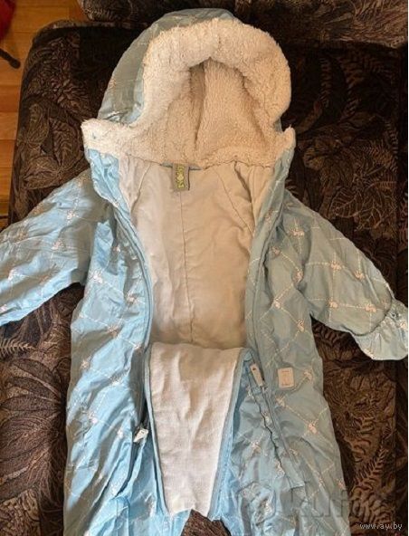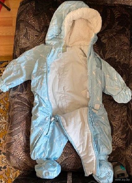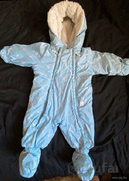 Отличный утепленный комбинезон для малыша, маркировка 62, но большемерит, мы носили до 80см, б/у один сезон, ездили в коляске в нем зимой, дефектов никаких нет. Ботиночки на ножки и варежки на кнопках. Цвет красивый нежно-голубой, на фото передать не удалось.
