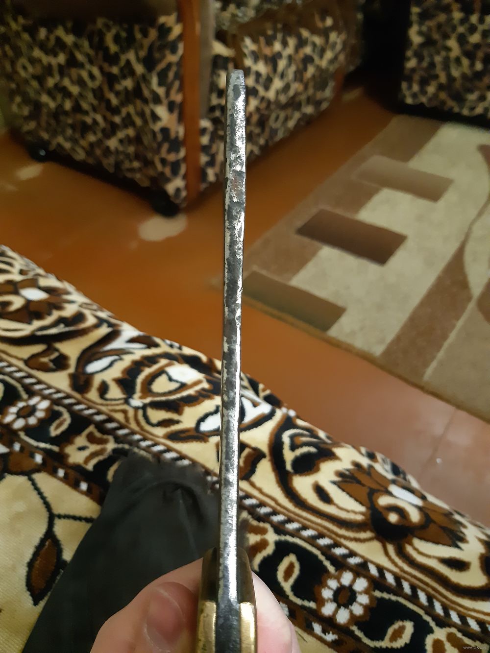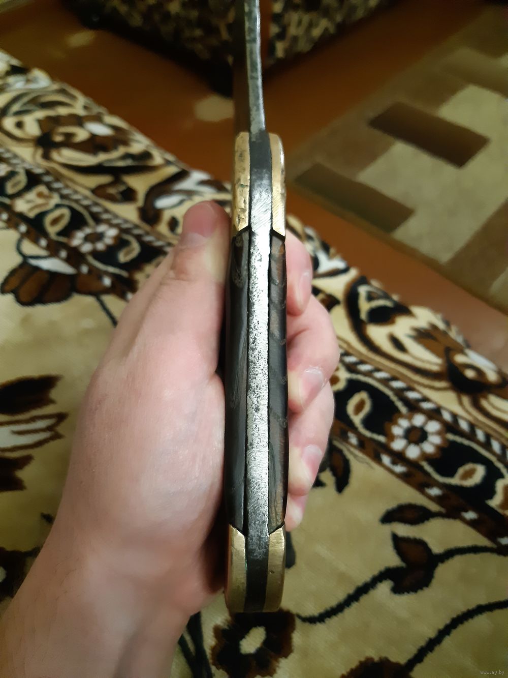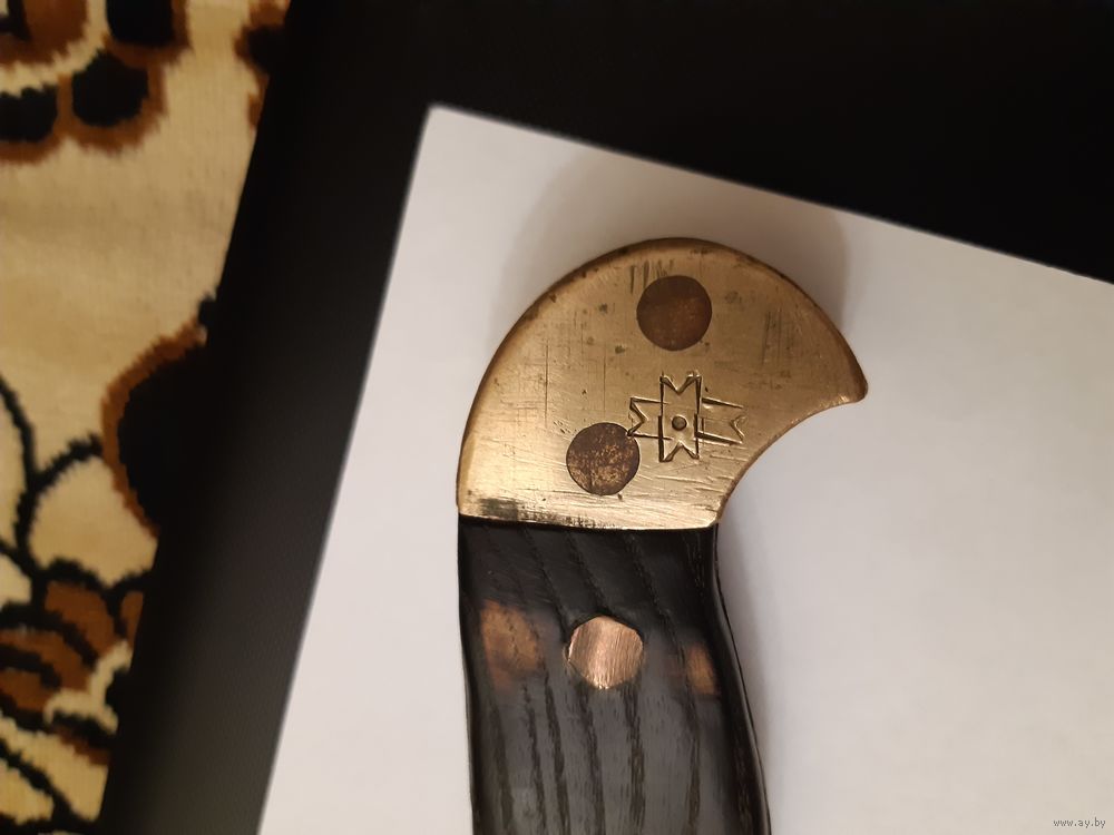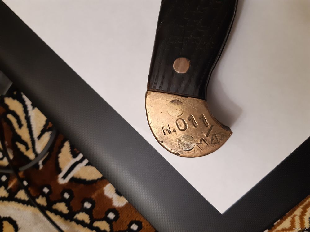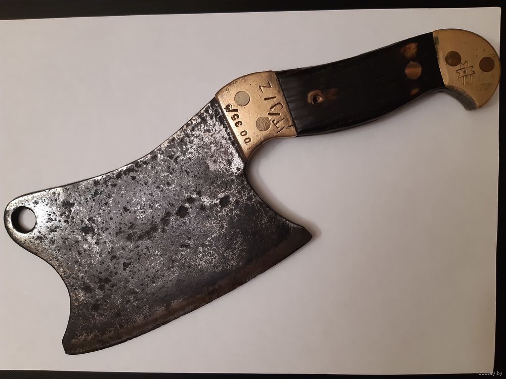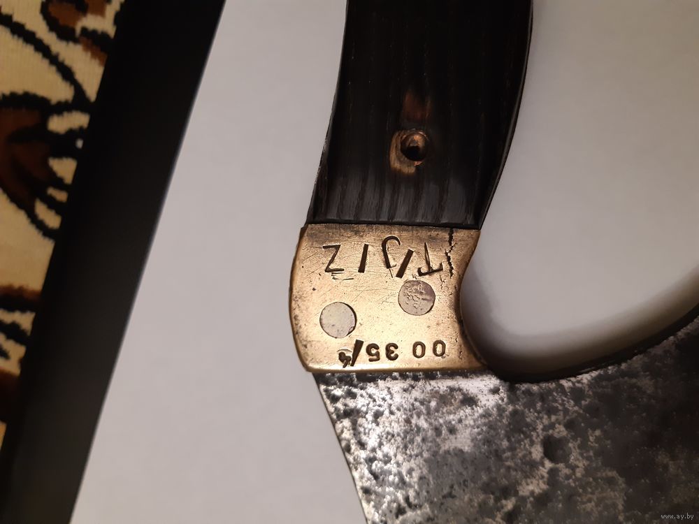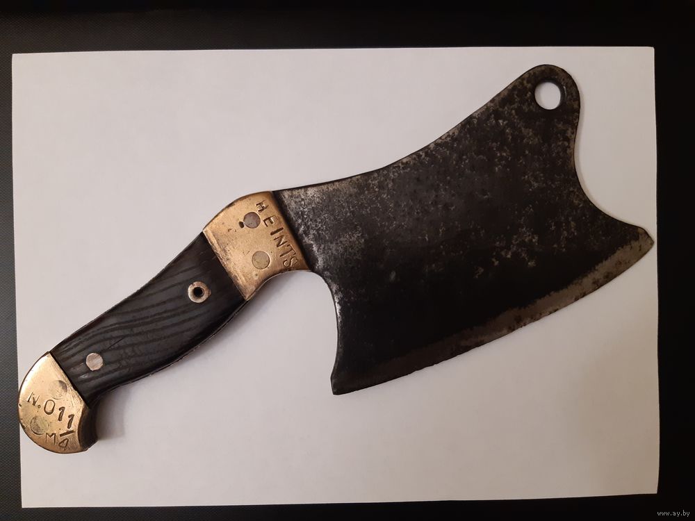 Продаю тесак (топорик) времён Первой Мировой Войны. Немецкий, в хорошем состоянии. Работа топорная, но выполнена крепко, ничего не люфтит и не болтается. Рукоять из твёрдых пород дерева, заклёпки медные. Накладки латунные, заклёпки также латунные. Общая длина 29 см, длина лезвия 16 см, ширина лезвия 10 см. Имеется отверстие для подвешивания. Также на накладках имеется множество различных клейм. "HEINTS" - возможно имя или фамилия владельца, а возможно название завода-изготовителя. Могу выслать почтой в пределах Республики Беларусь. Без торга.