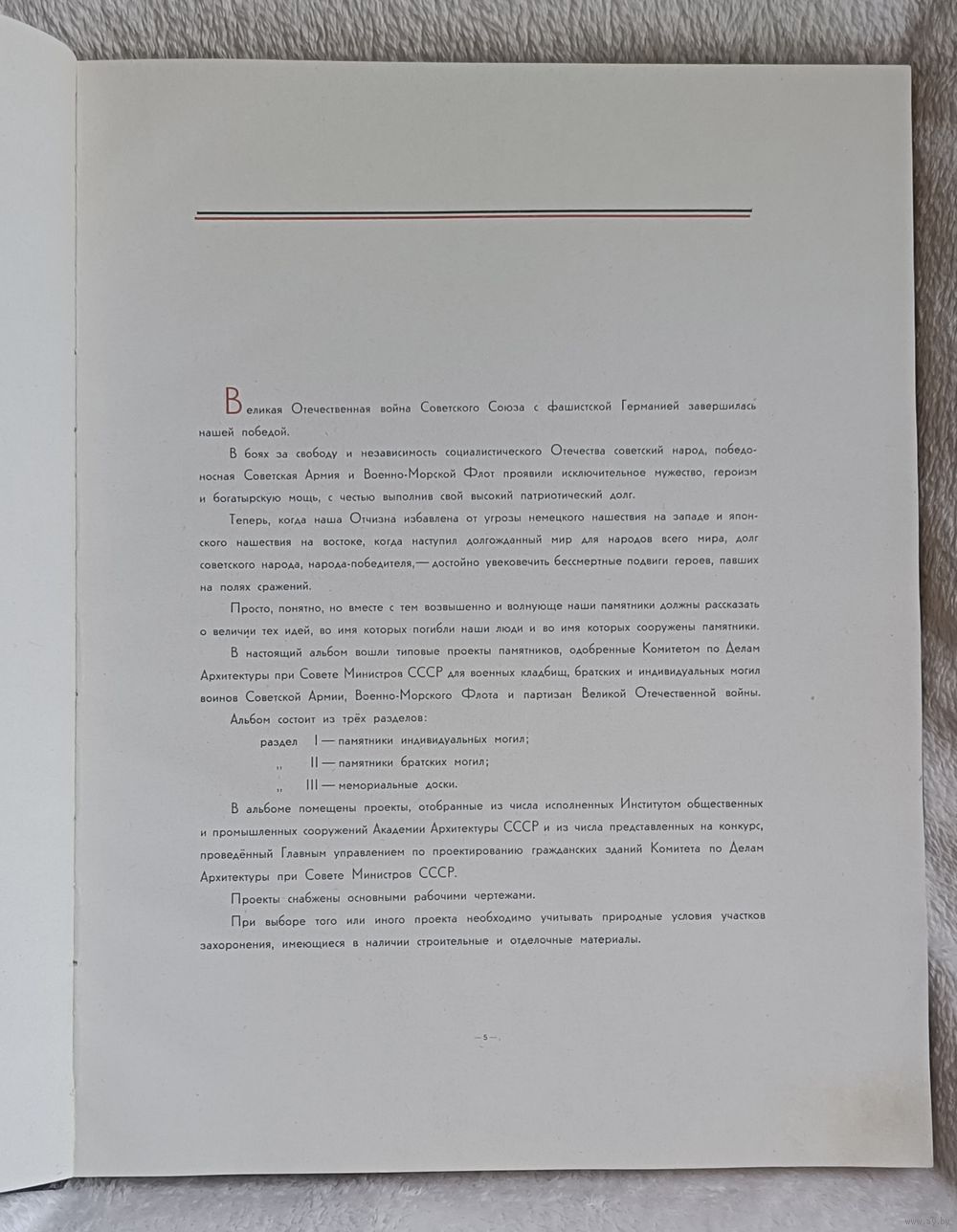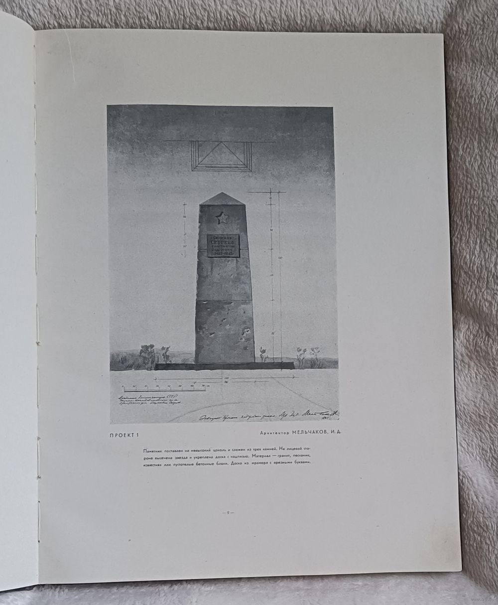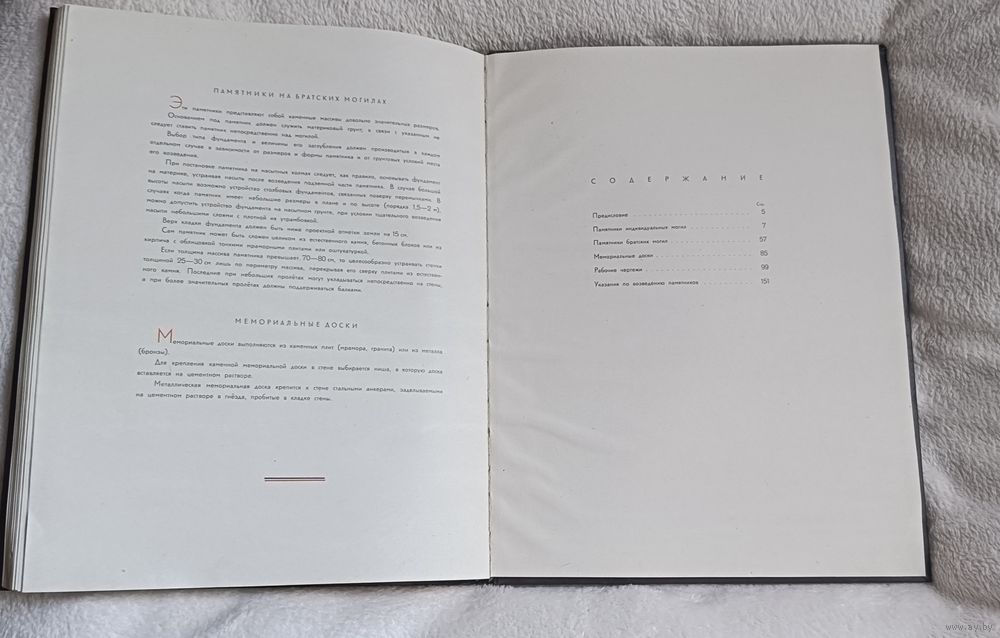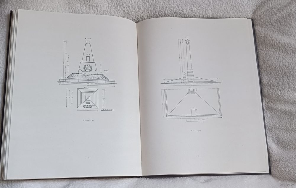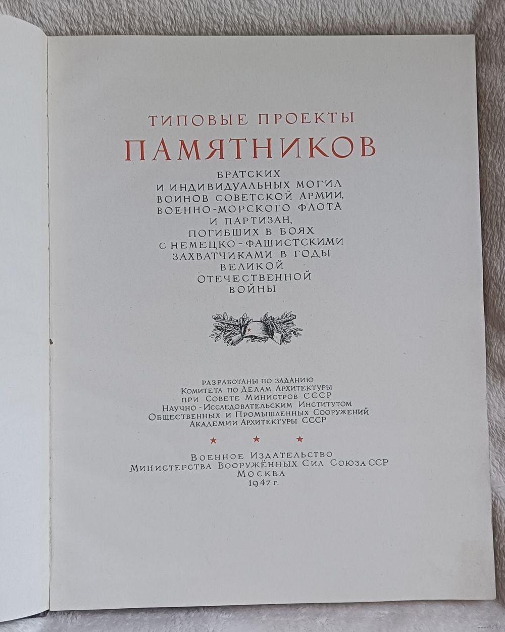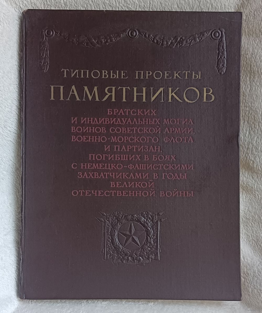 Типовые проекты памятников братских и индивидуальных могил воинов Советской армии, военно-морского флота и партизан, погибших в боях с немецко-фашистскими захватчиками в годы Великой Отечественной войны / Под редакцией действительного члена Академии архитектуры СССР Н. Я. Колли ; Разработано по заданию Комитета по делам архитектуры при Совете министров СССР научно-исследовательским институтом общественных и промышленных сооружений Академии архитектуры СССР. — Москва : Военное издательство Министерства вооруженных сил Союза ССР, 1947. — 153 с., ил.,твердый переплет, увеличенный формат (размер книги в см 35х26х2)