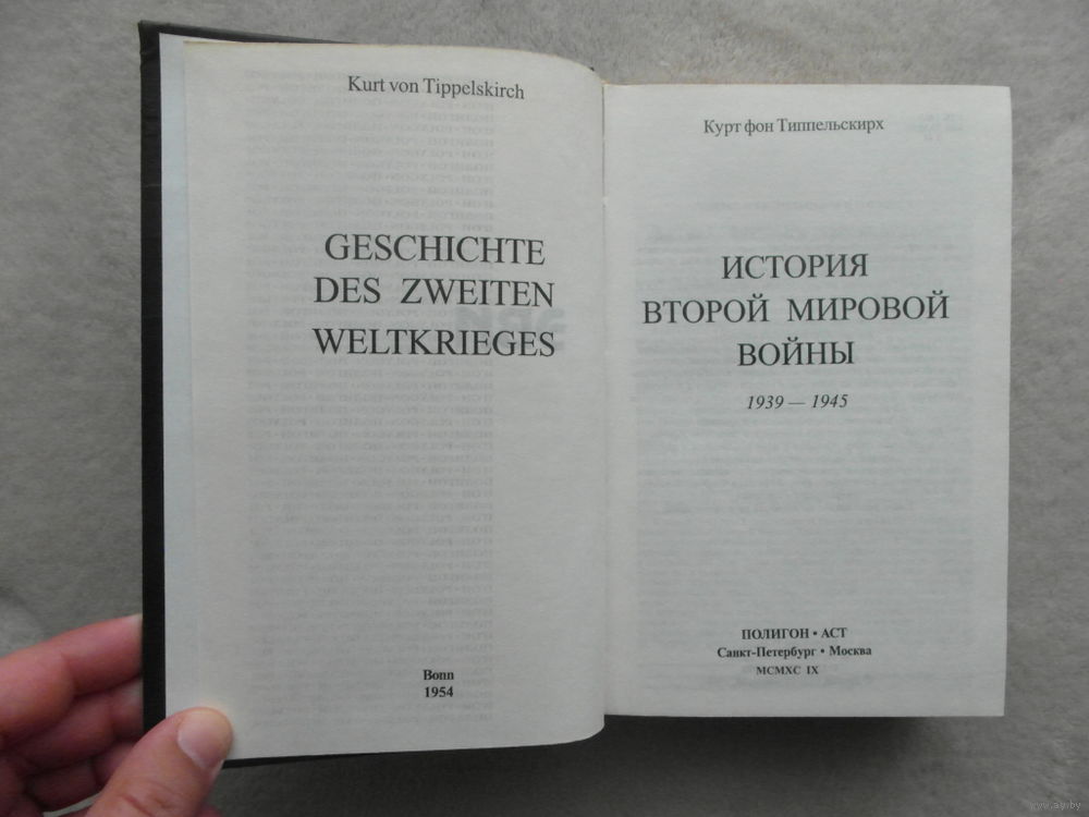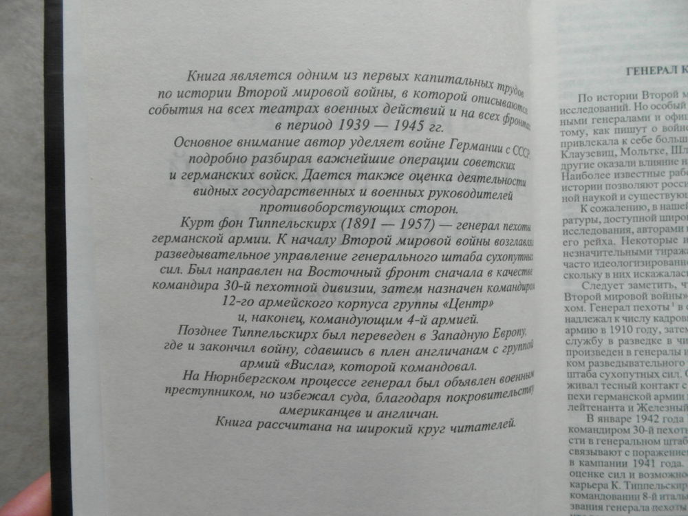 Книга является одним из первых капитальных трудов по истории Второй Мировой войны, в которой описываются события на всех театрах военных действий и на всех фронтах в период 1939 - 1945 гг. Основное внимание автор уделяет войне Германии с СССР, подробно разбирая важнейшие операции советских и германских войск. Дается также оценка деятельности видных государственных и военных руководителей противоборствующих сторон. Курт фон Типпельскирх (1891 - 1957) - генерал пехоты германской армии. К началу Второй Мировой войны возглавлял разведывательное управление генерального штаба сухопутных сил. Был направлен на Восточный фронт сначала в качестве командира 30 - й пехотной дивизии, затем назначен командиром 12 - го армейского корпуса группы Центр и, наконец, командующим 4 - й армией. Позднее Типпельскирх был переведен в Западную Европу, где и закончил войну, сдавшись в плен англичанам с группой армий Висла, которой командовал. На Нюрнбергском процессе генерал был объявлен военным преступником, но избежал суда, благодаря покровительству американцев и англичан . Книга рассчитана на широкий круг читателей.