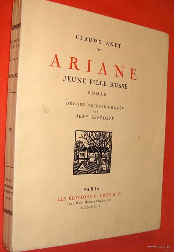 Редкая книга Анэ, Клод. Русская девушка Ариадна/ Иллюстрации Ивана Лебедева. Claude Anet. Ariane, jeune fille russe. Decore de bois graves par Jean Lebedeff. Paris: G. Cres et Cie, 1924. 24,7 х 19,5 см. XIII,174 c.с илл. 1-ое изд. Тираж 1150 экз. Этот экз. имеет No 601. На фр. языке. Издание иллюстрировано гравюрами на дереве работы Ивана Лебедева. В трехцветной иллюстрированной издательской обложке. Экземпляр на бумаге velin du Marais. Отличная сохранность Экземпляр No 601 много гравюр тираж1000экз.