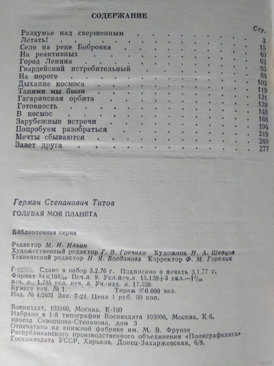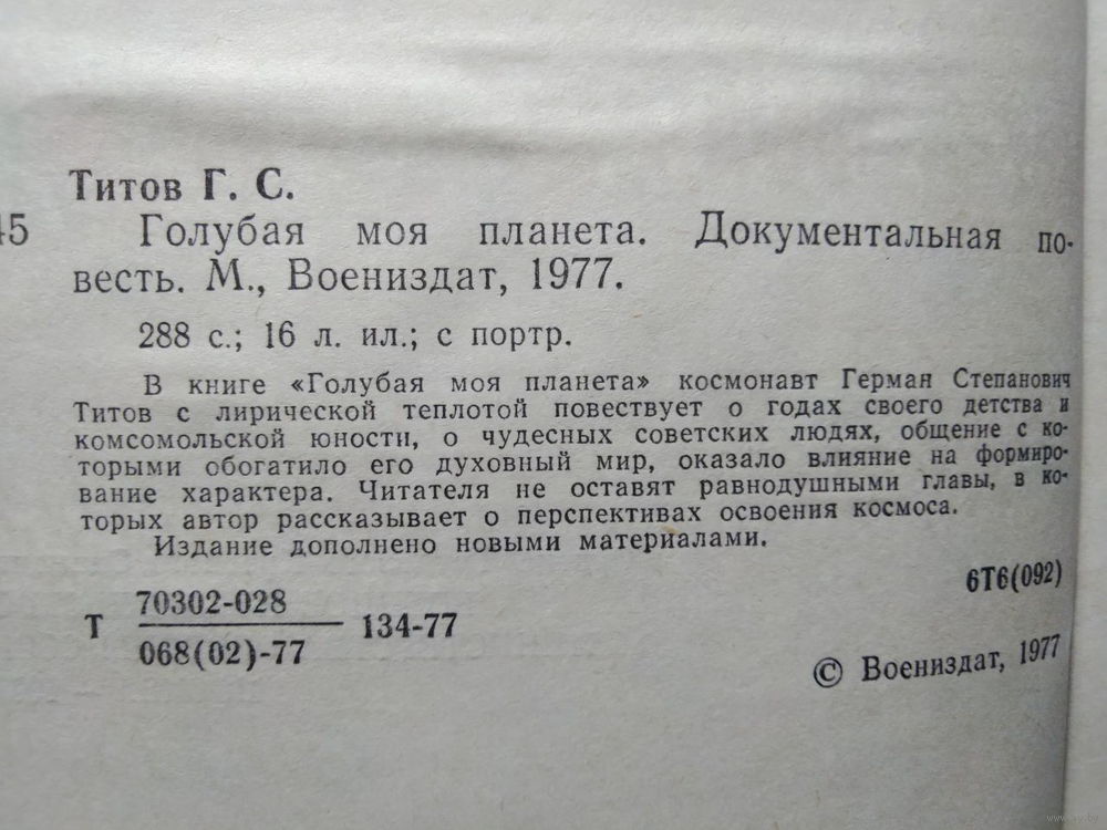 31. В книге Голубая моя планета космонавт Герман Степанович Титов с лирической теплотой повествует о годах своего детства и комсомольской юности, о чудесных советских людях, общение с которыми обогатило его духовный мир, оказало влияние на формирование характера. Читателя не оставят равнодушными главы, в которых автор рассказывает о перспективах освоения космоса.