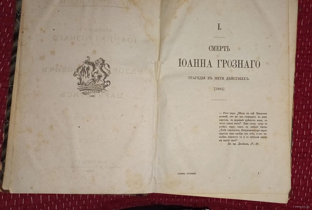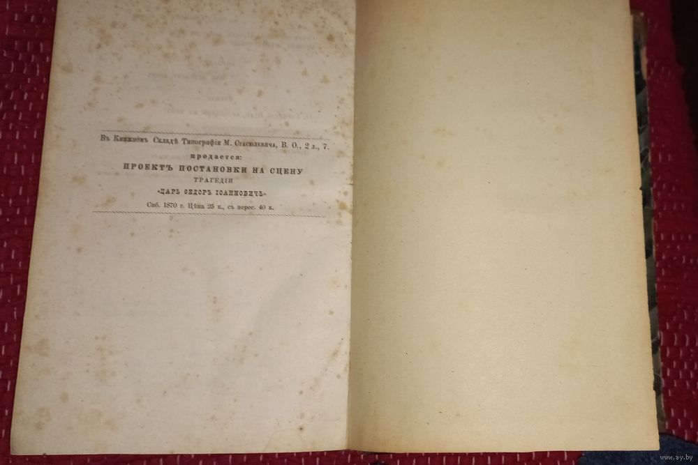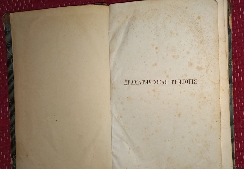 Толстой, А.К. Драматическая трилогия. I. Смерть Иоанна Грозного. II. Царь Федор Иоаннович. III. Царь Борис. СПб.: Тип. М.М. Стасюлевича, 1876. 146 с. 24×15 см. Во владельческом полукожаном переплете эпохи. Потертости переплета, утрата фрагмента корешка. Разлом маленький. Лисьи пятна, фрагментарные загрязнения страниц