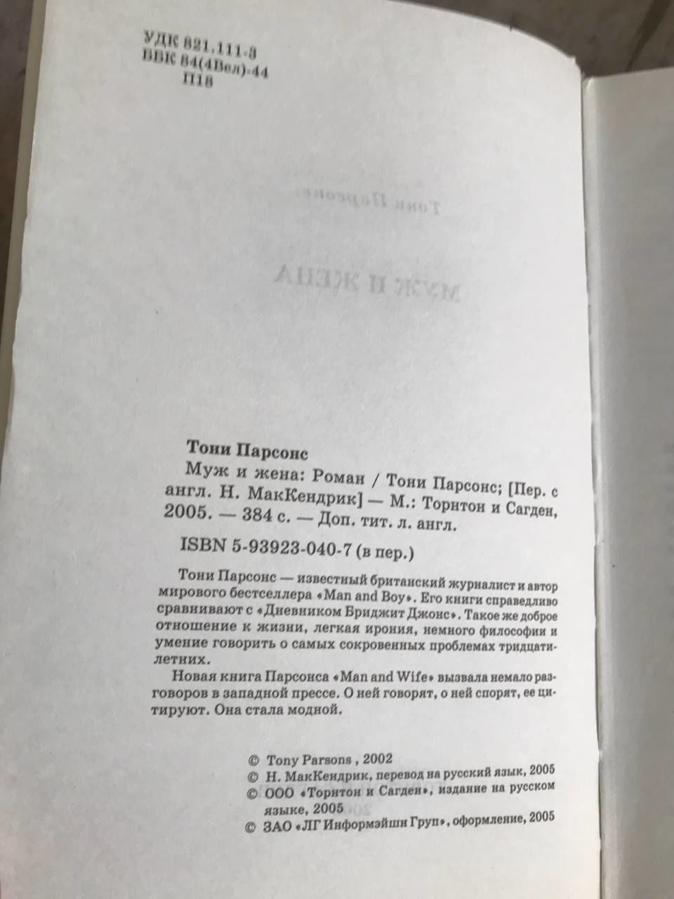 Тони Парсонс MAN AND WIFE / Муж и Жена