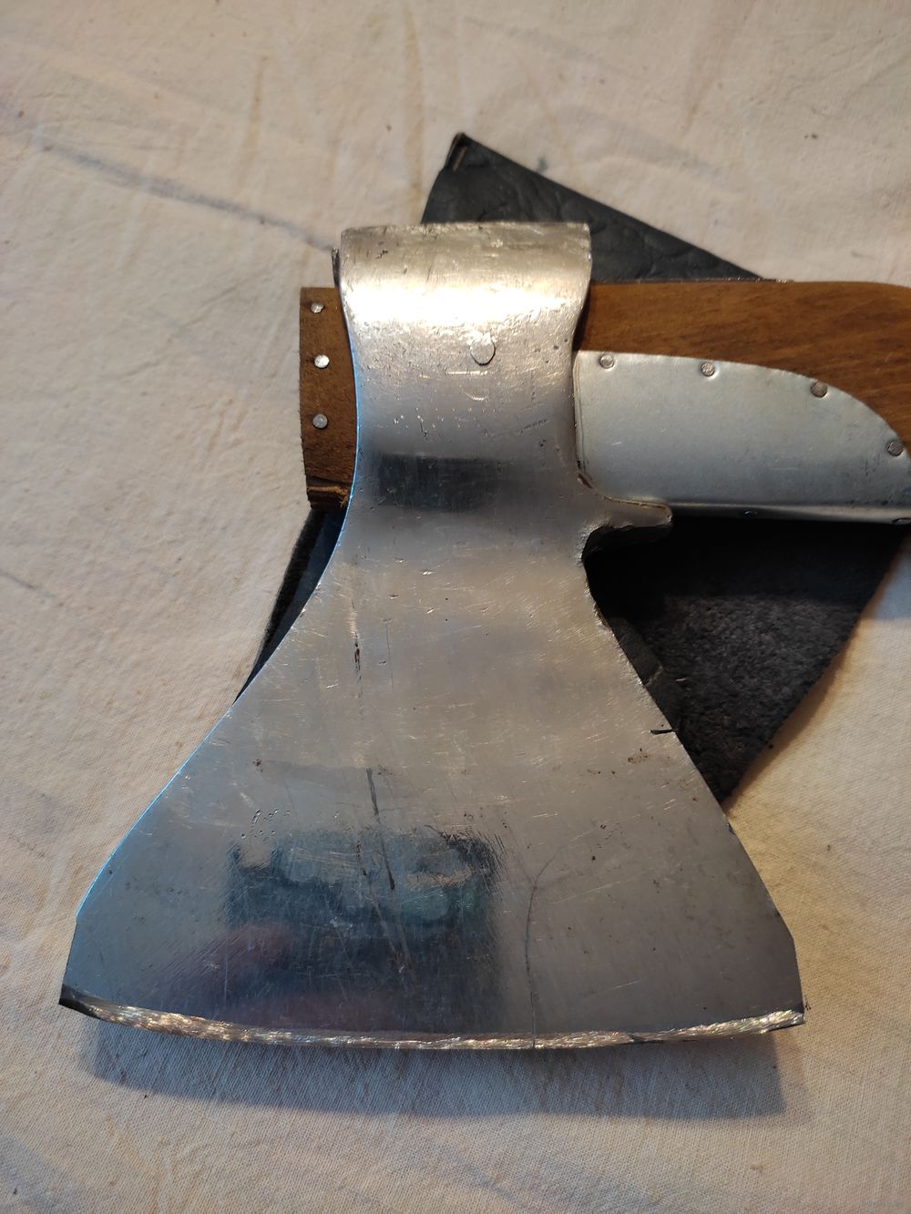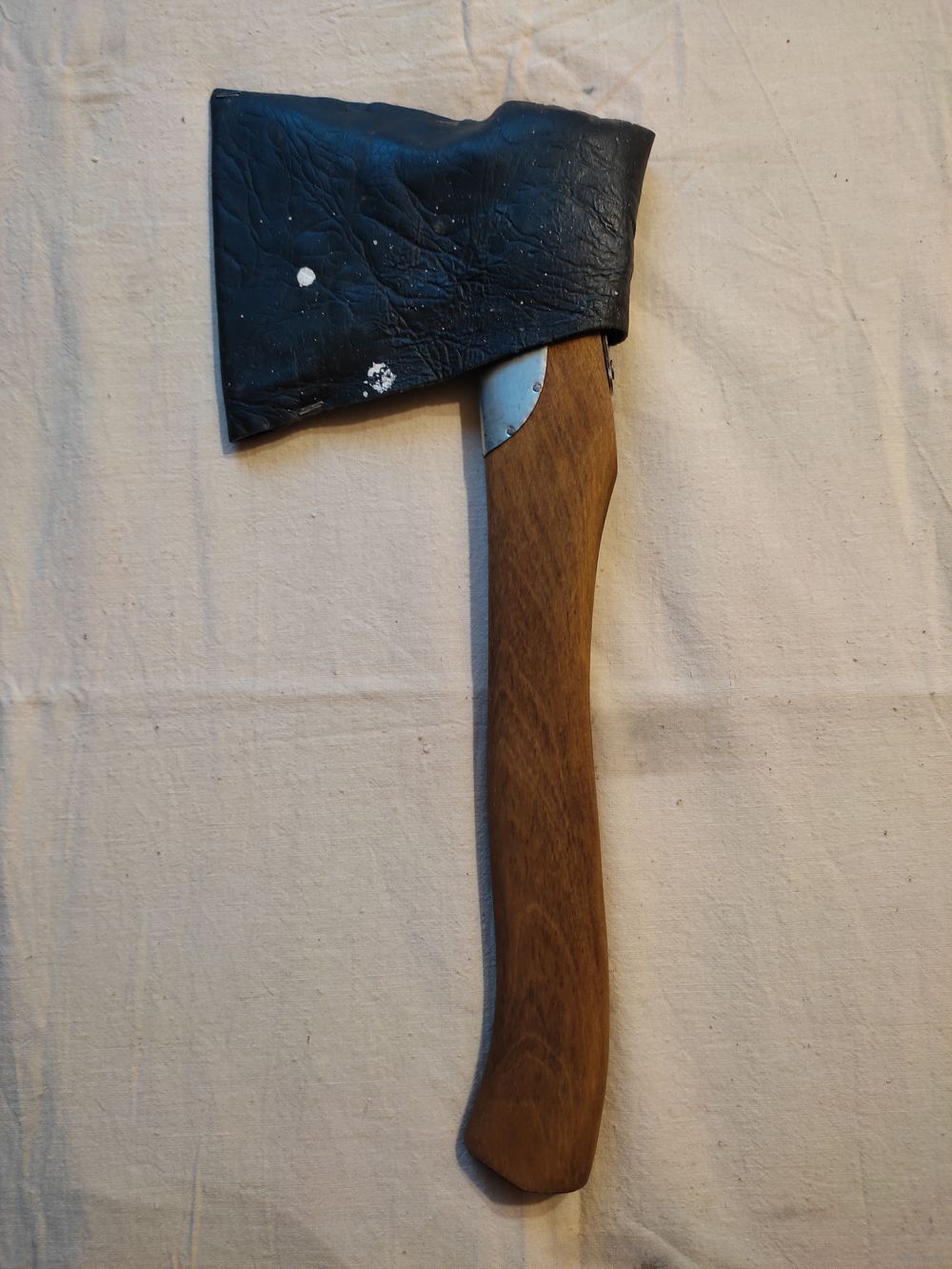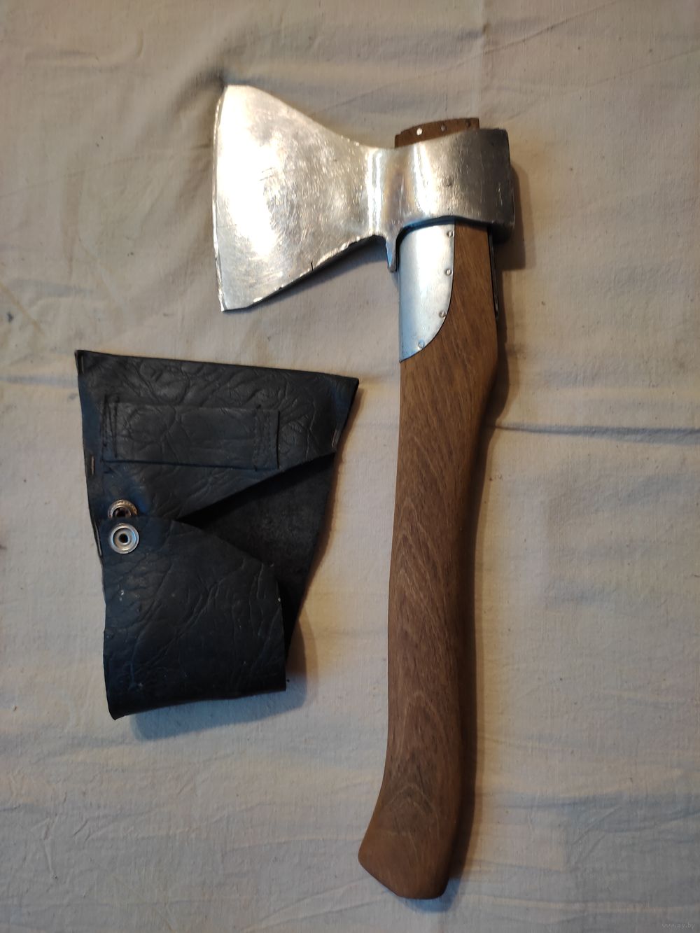 Топор малый СССР , самоделка , покрыт никелем , с чехлом. ВНИМАНИЕ : на лезвии есть трещина от сильного закала , но он еще поработает. Вес с рукояткой - 932 гр , ширина лезвия - 12,7 см , длина рукоятки - 38,5 см , материал рукоятки - береза ( тонировка ). Осажен прочно и надежно ( двойная защита , тройной клин ) , наточен , готов к работе. Отличная сталь СССР ! Высылаю : Белпочта , Европочта.