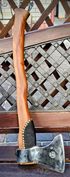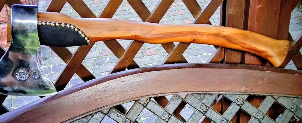 Топор "Златоуст" 1953г,сталь У7, ширина лезвия 14см,высота 19см,длина топорища 61см (дикая груша, отделка натуральная кожа,латунь) ,пропитано маслом с воском,