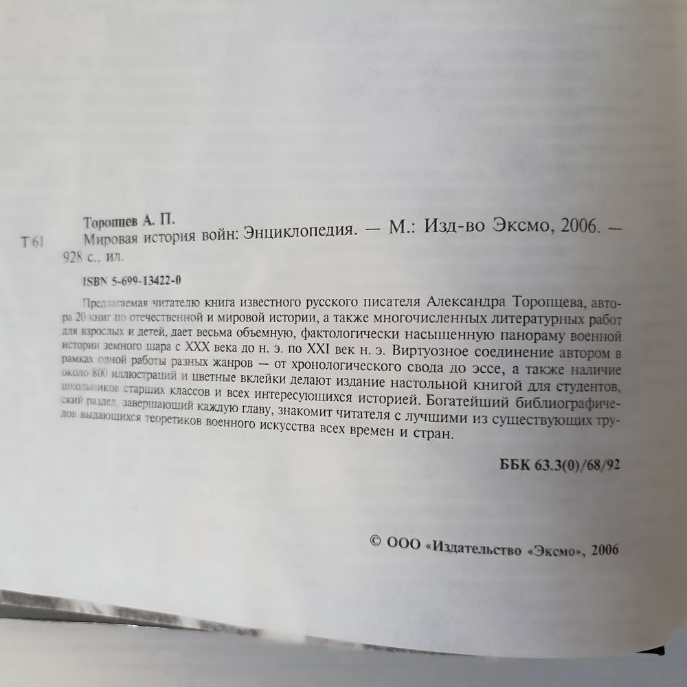 Предлагаемая читателю книга известного русского писателя Александра Торопцева, автора 20 книг по отечественной и мировой истории, а также многочисленных литературных работ для взрослых и детей, дает весьма объемную, фактологически насыщенную панораму военной истории земного шара с XXX века до н.э. по XXI век н.э. Виртуозное соединение автором в рамках одной работы разных жанров - от хронологического свода до эссе, а также наличие около 800 иллюстраций и цветные вклейки делают издание настольной книгой для студентов, школьников старших классов и всех интересующихся историей. Богатейший библиографический раздел, завершающий каждую главу, знакомит читателя с лучшими из существующих трудов выдающихся теоретиков военного искусства всех времен и стран.Год выпуска2004Количество страниц928 страниц