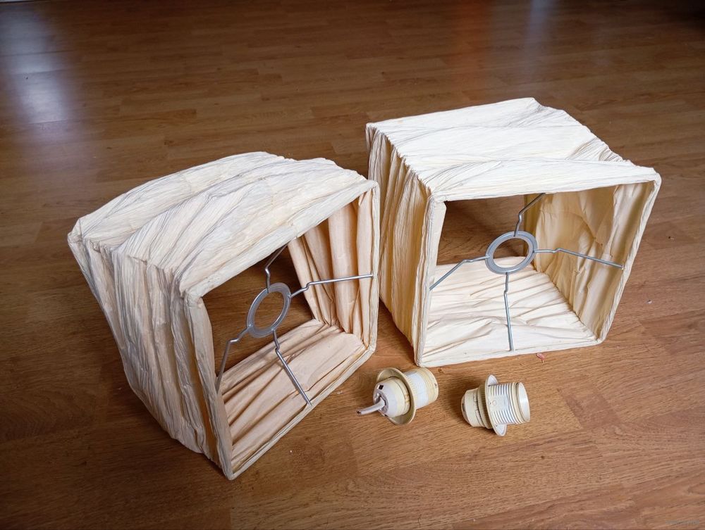 2 плафона (абажура) люстр на потолок 30 х 22 см. На одном немного (3 см) порез на сгибе – легко склеить. У них нет 4 проволоки, удерживающих их в расправленном состоянии – легко сделать новые.