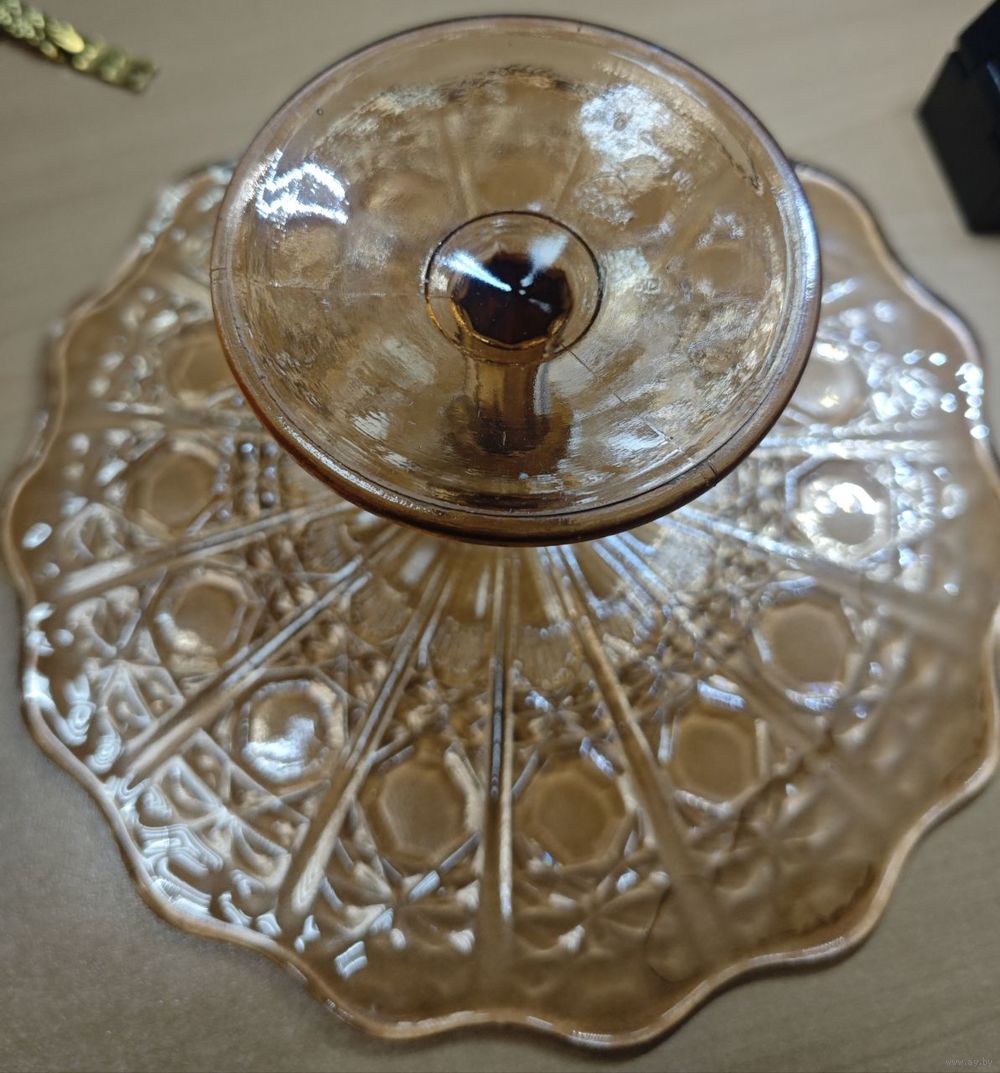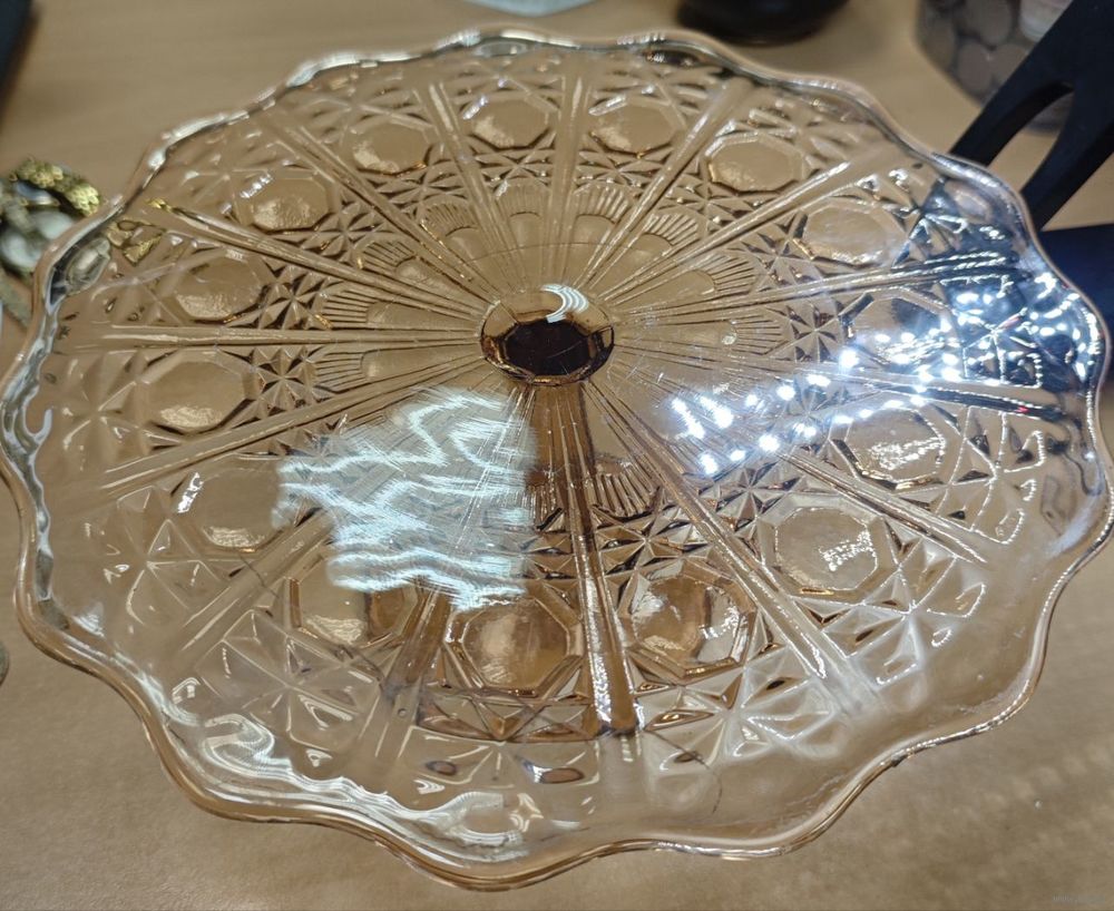 Тортница, украшенная геометрическим декором, цветное стекло. СССР, 1950-1960 гг. 26 см