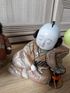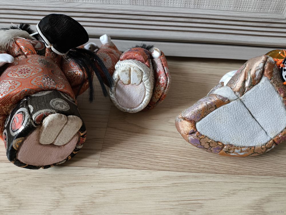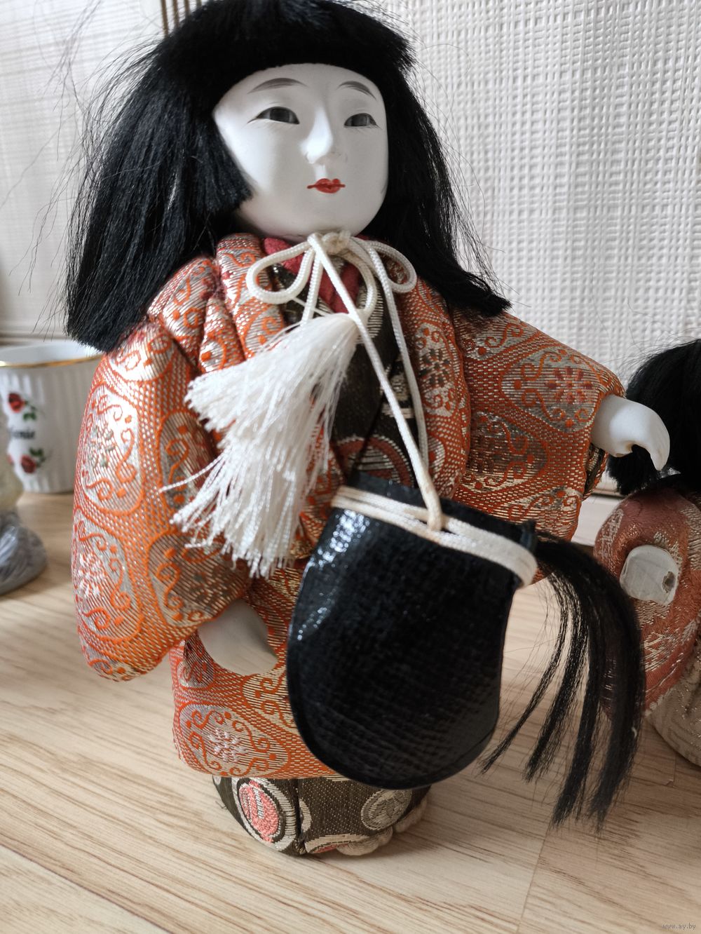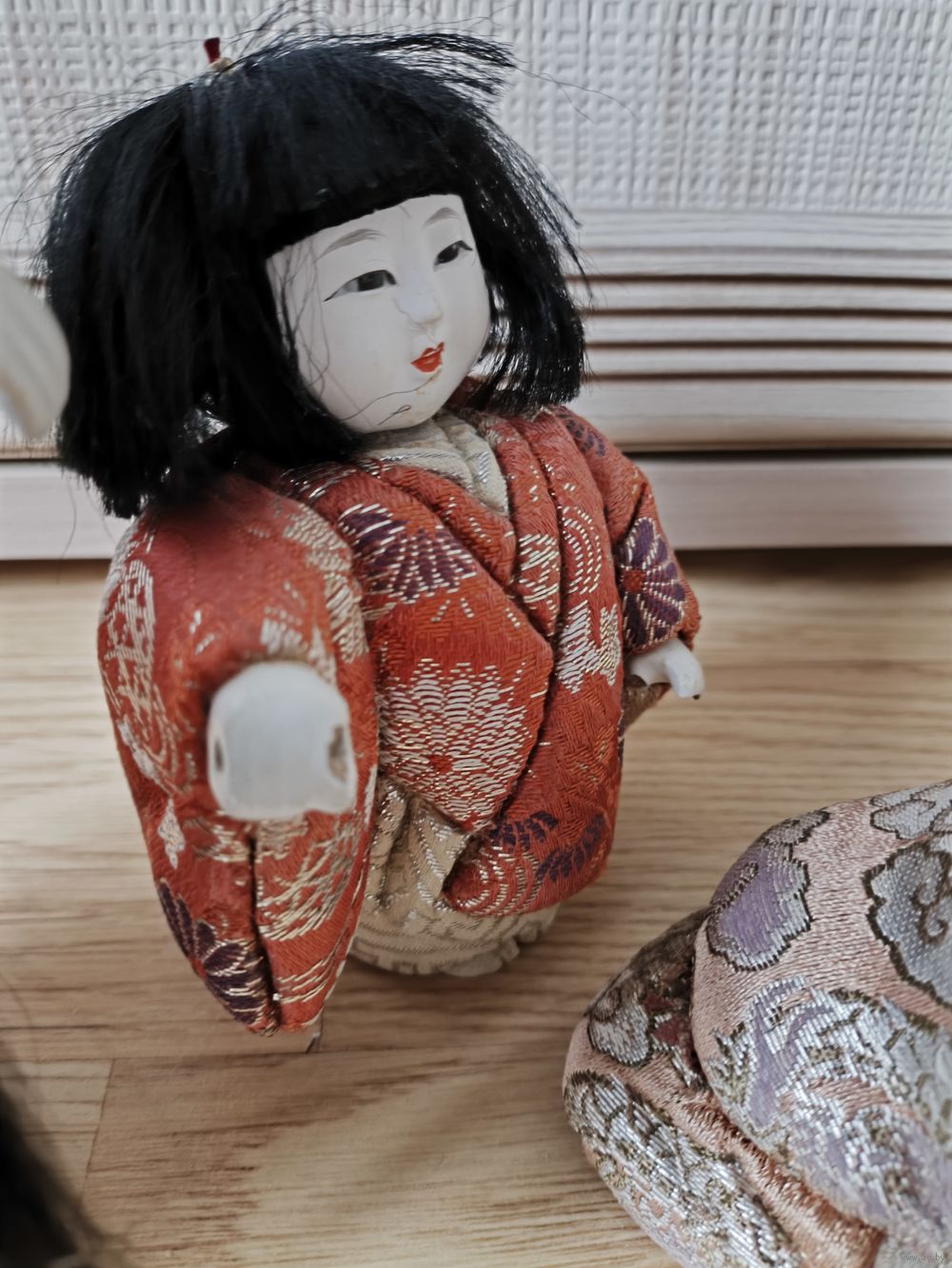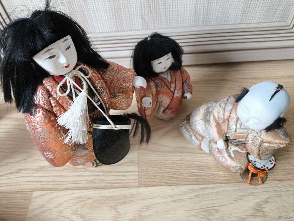 Традиционные винтажные японские куклы кимекоми. Коллекционный предмет декора. Кимоно с цветочным узором и золотой вышивкой, в хорошем состоянии, с незначительными следами износа и лёгкими потертостями из-за возраста.