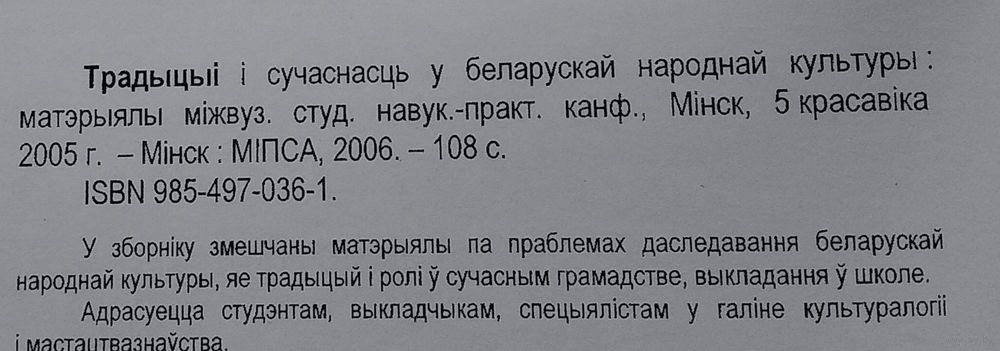 Традыцыі і сучаснасць у беларускай народнай культуры: матэрыялы міжвузаўскай студэнцкай навукова-практычнай канферэнцыі, Мінск, 5 красавіка 2005 г. Рэдкалегія: Я.К.Адамовіч і інш. Мінск : МІПСА, 2006 г. 107 с. Мяккая вокладка.