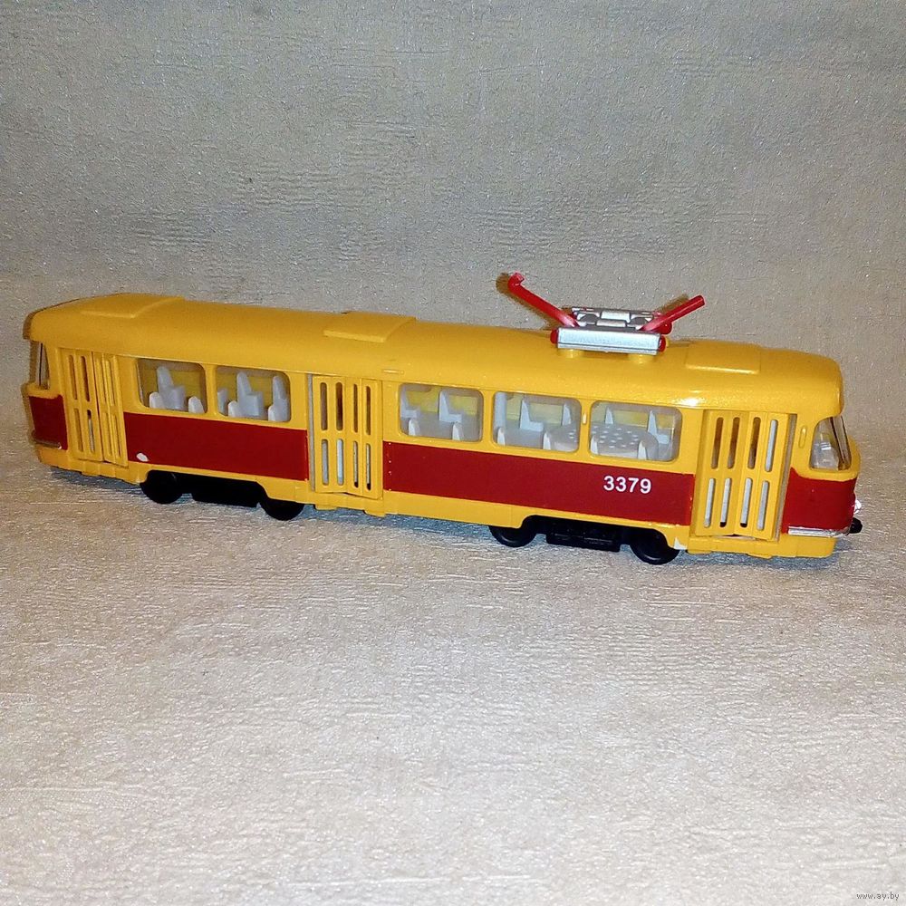 | На фото, пластик, отломана дуга, при нажатии на переднюю пару колёс мигает фарами и объявляет остановку. Продаётся без батареек! | |