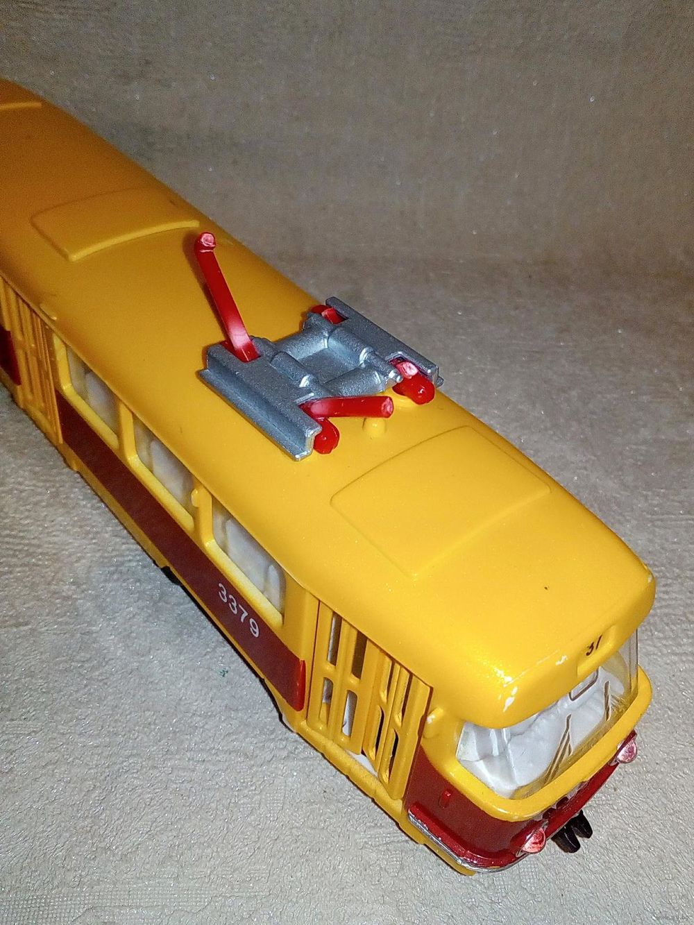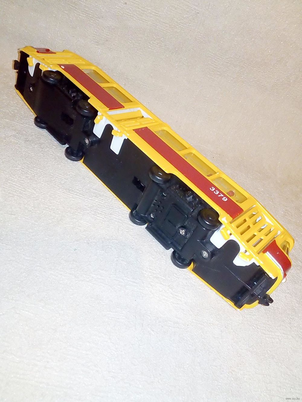 | На фото, пластик, отломана дуга, при нажатии на переднюю пару колёс мигает фарами и объявляет остановку. Продаётся без батареек! | |