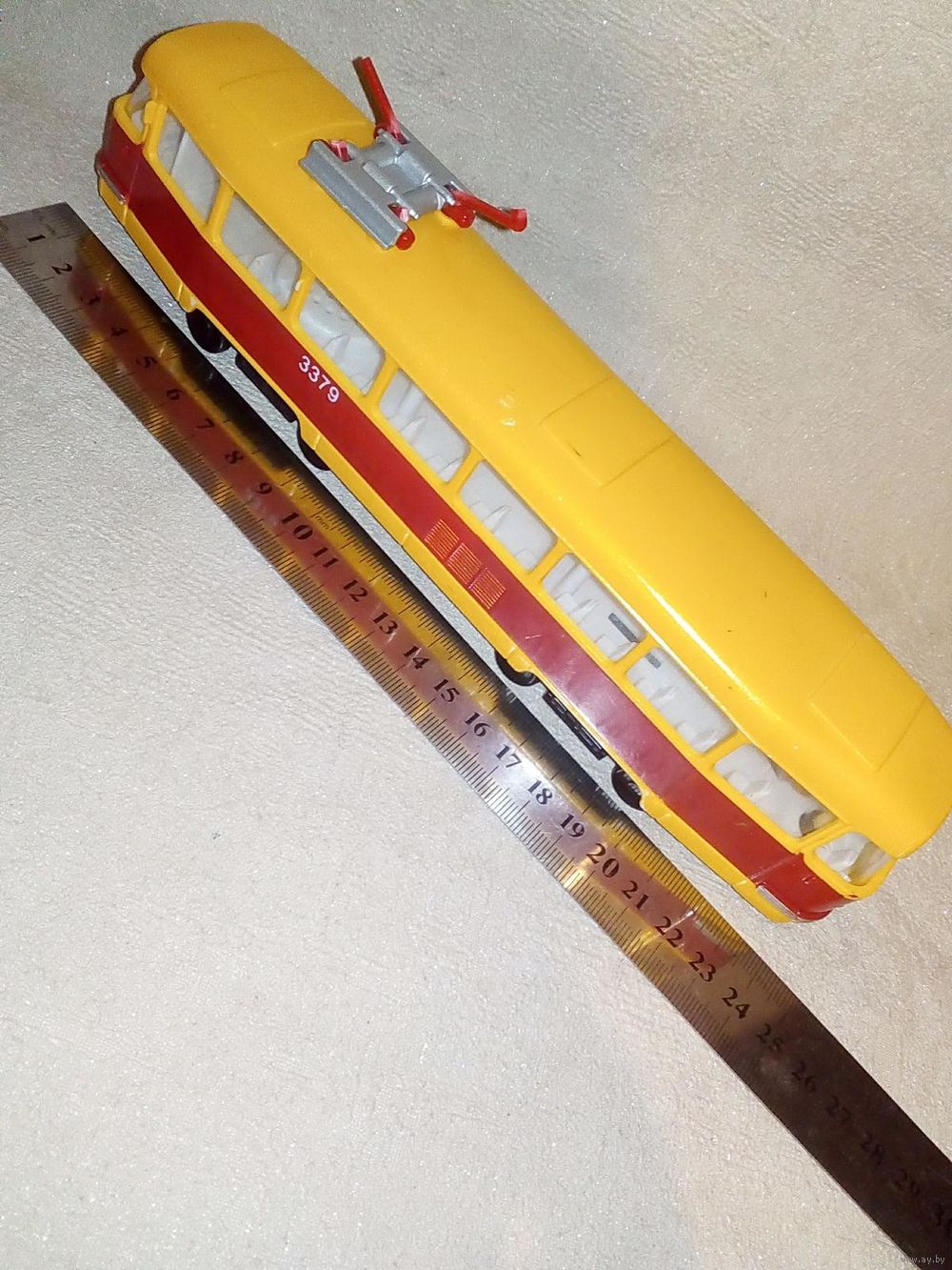 | На фото, пластик, отломана дуга, при нажатии на переднюю пару колёс мигает фарами и объявляет остановку. Продаётся без батареек! | |
