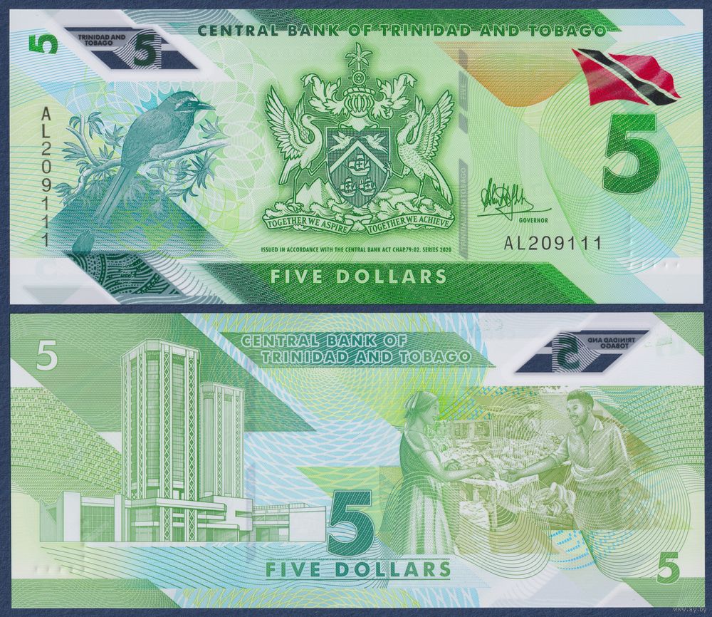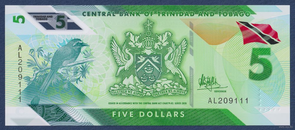 Тринидад и Тобаго, 5 долларов 2020 г, P-W61 (AL, полимер, cинекоронный мотмот), UNC