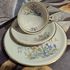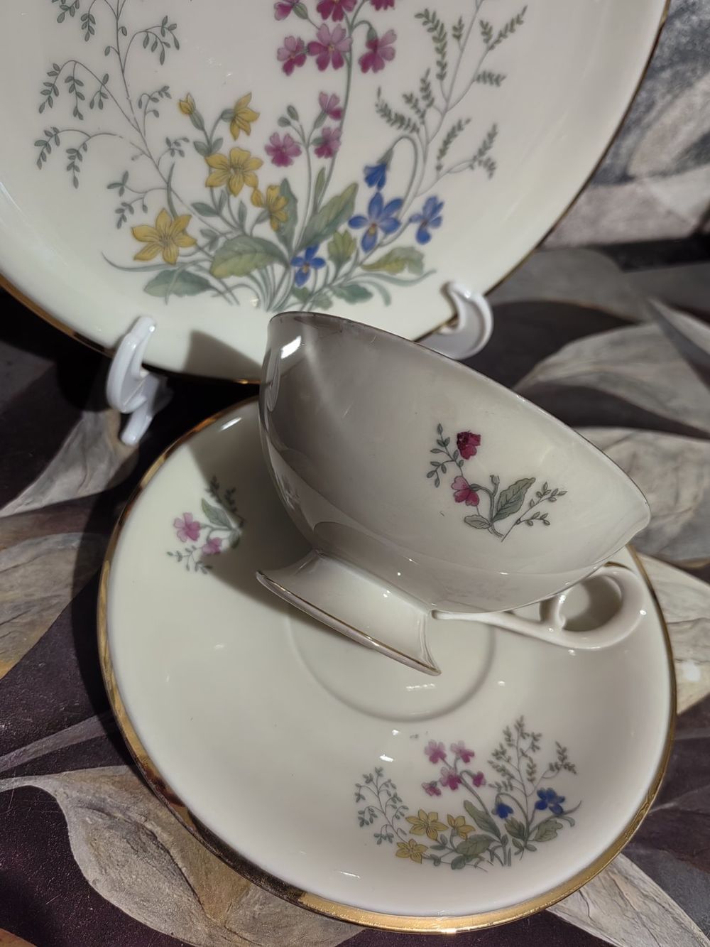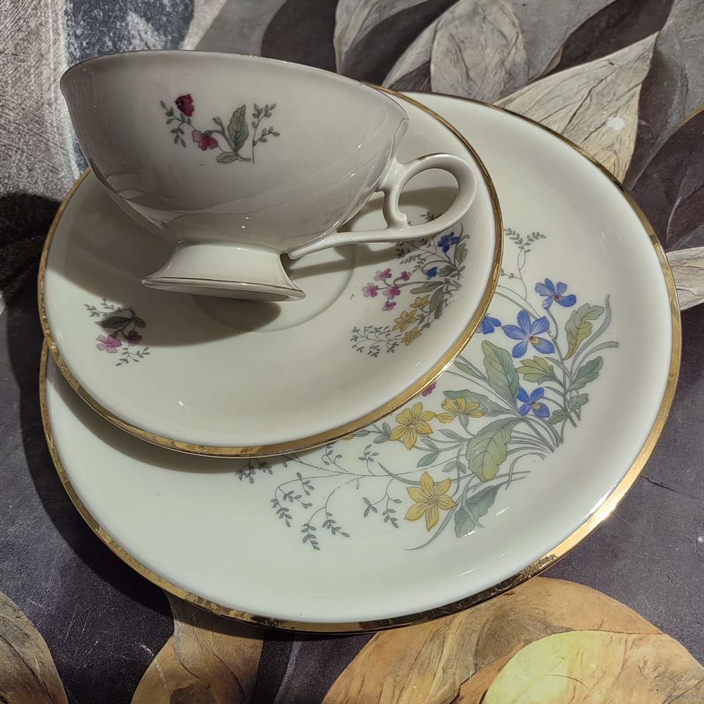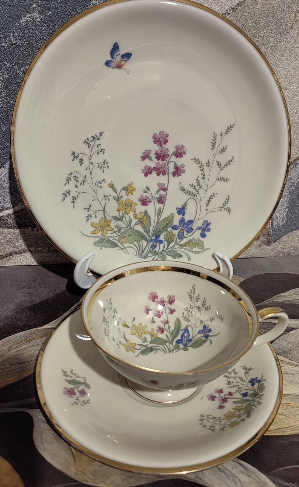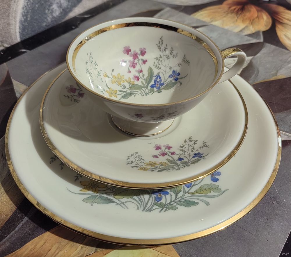 Трио немецкой мануфактуры Schirnding, клеймо с эдельвейсом, 1949 - 1956 гг. Отличная сохранность, без нюансов. Молочный фарфор, лёгкий и тонкий, с ботанический тематикой.