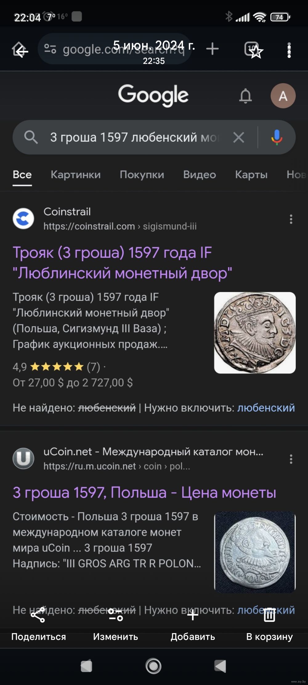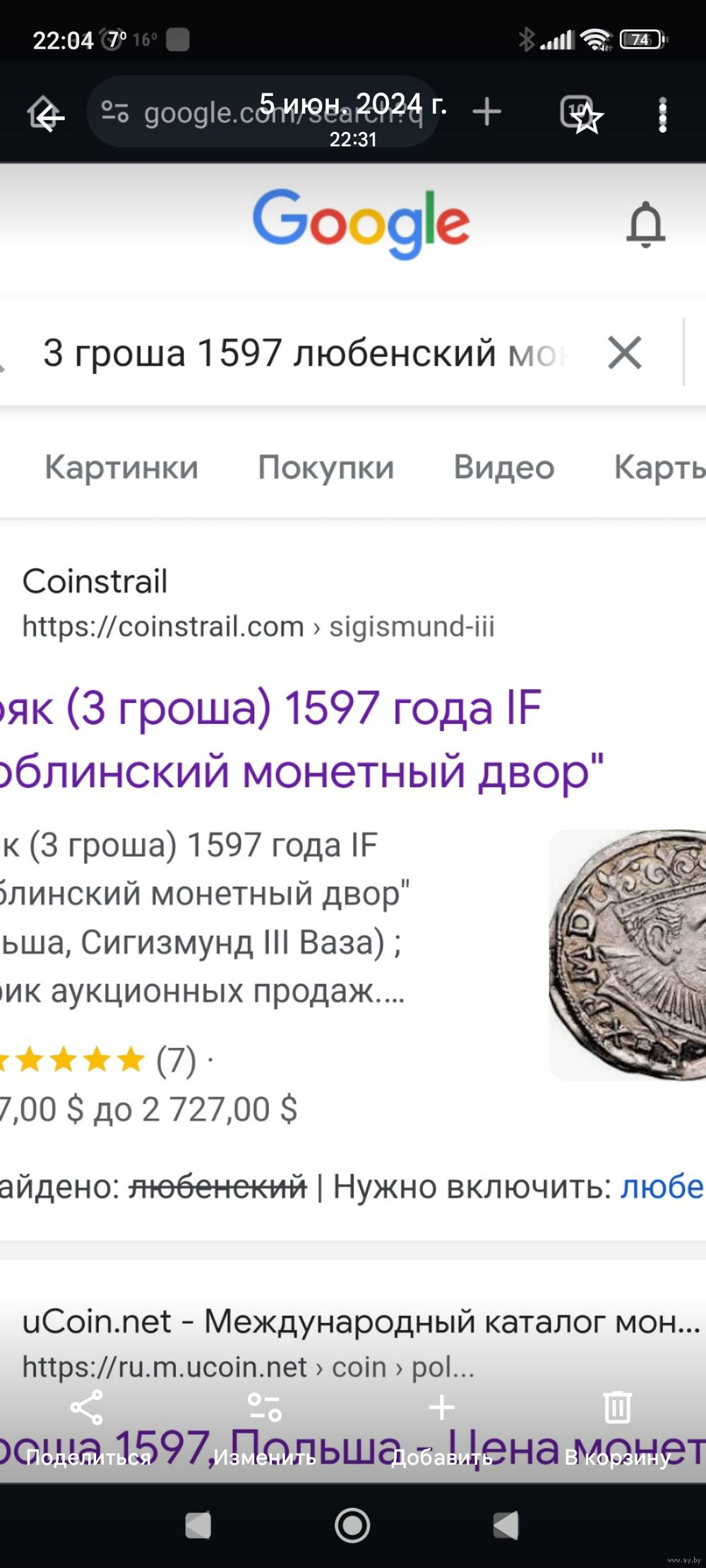 | Номинал | Трояк (3 гроша) 1597 года IF "Люблинский монетный двор" (Польша, Сигизмунд III Ваза) |